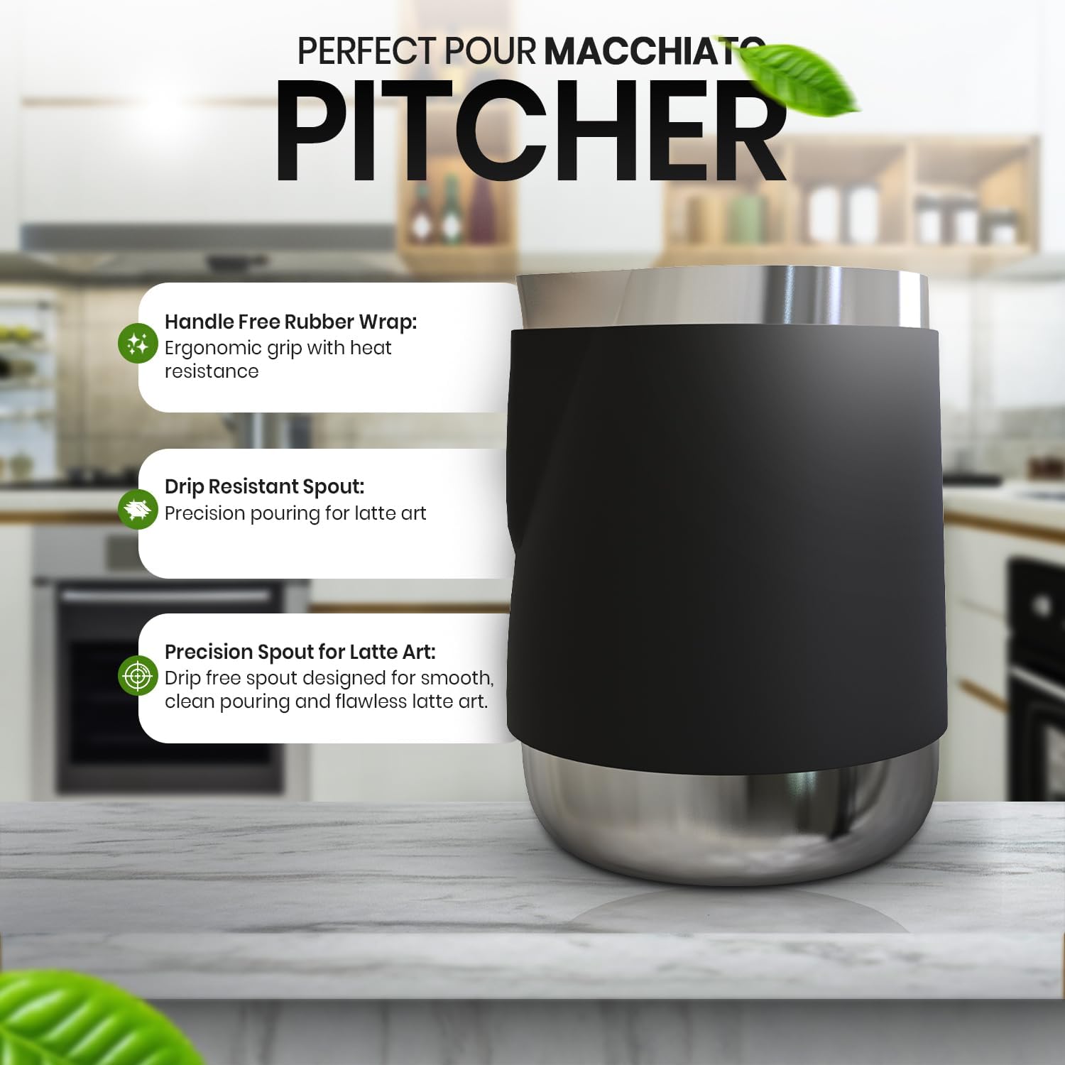 - ๐๐๐๐๐๐-๐ ๐๐๐ ๐๐๐๐๐๐ ๐๐๐๐ ๐ ๐๐ ๐๐๐ ๐๐๐: The pitcher is designed without a traditional handle. This pitcher features a secure rubber grip that insulates your hand from heat. The wrap provides a steady, slip-free hold, giving baristas precise control while steaming milk or pouring designs.