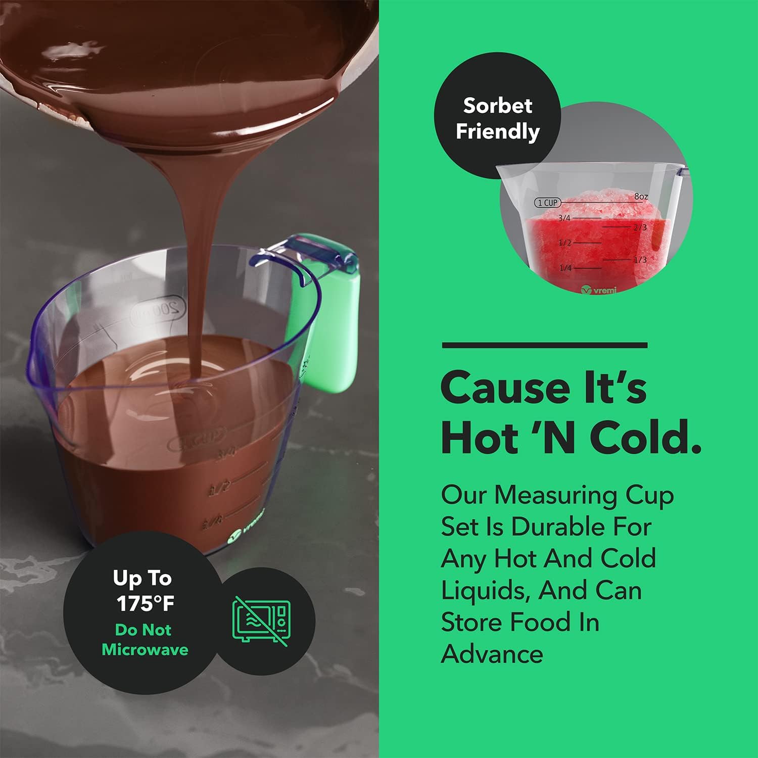 - Each lightweight and heat resistant measuring cup features an ergonomic, non-slip, silicone handle in red, blue or green for excellent control while pouring of water, cooking oil, vinegar and EVOO โ all with no spills