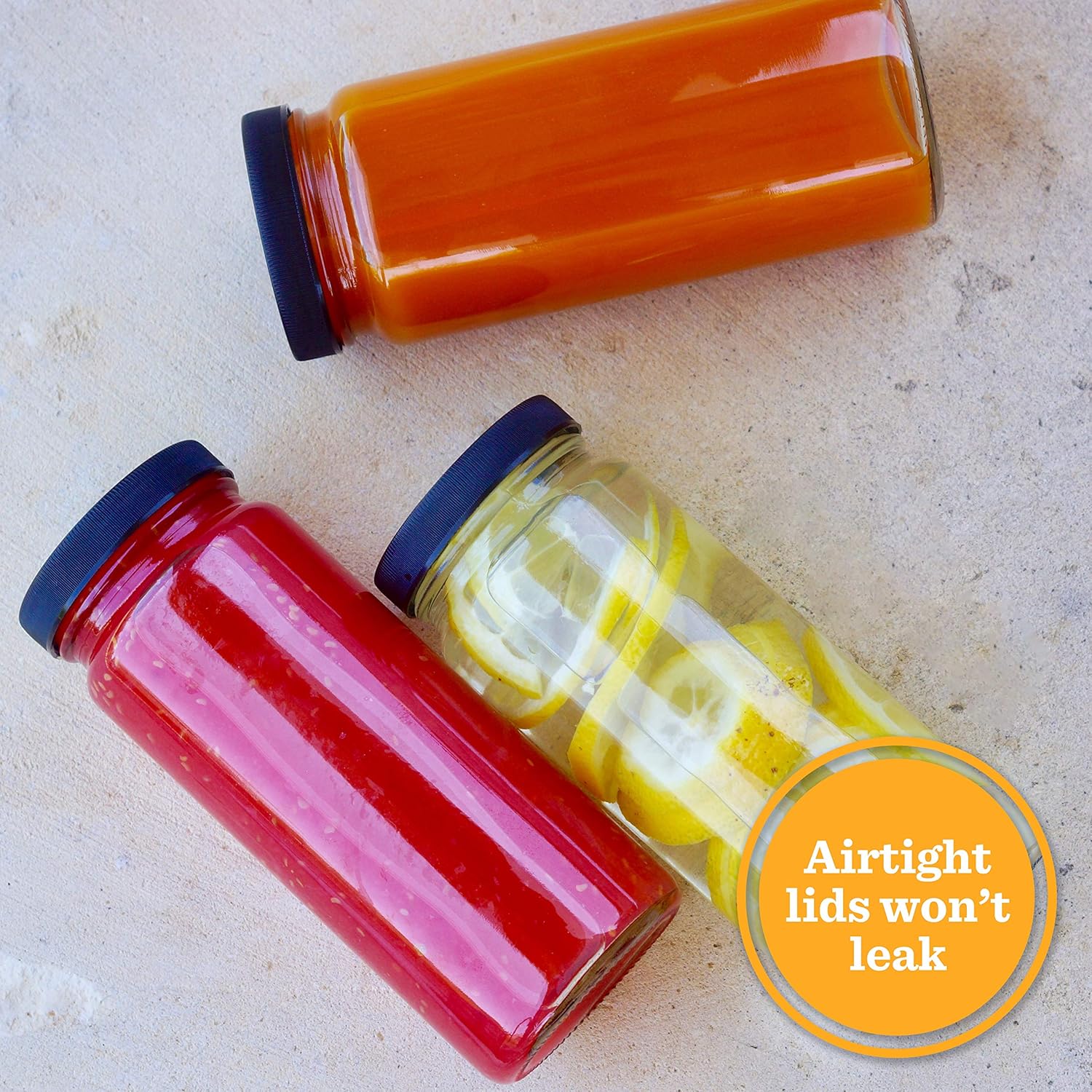 - AIRTIGHT FRESHNESS THAT WON’T LEAK - your juice won’t ooze to give you the blues, just lots of sealed-in goodness for fresh juices, smoothies, infused waters, summer lemonade, kombucha, nut milks, cold-brew coffee, iced-teas & delicious sauces