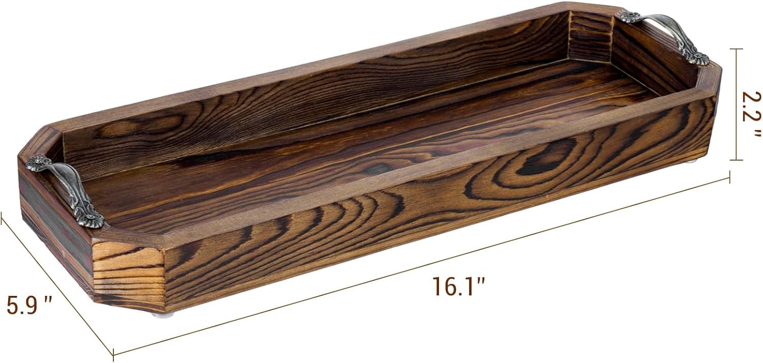 MyGift Wooden Vanity Tray, Rustic Burnt Solid Wood Toilet Tank Tray - Decorative Octagonal Cosmetic Organizer with Antique Metal Handles