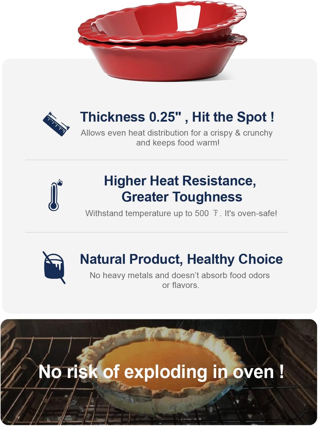 - Healthier Than Glass Pie Pan: The ceramic pie plate is made of using all-natural clay, water and gas; Each piece of pie tray is elegant and created with the finest detail; Compared to a glass or metal pie pan, the ceramic pie dish is free of heavy metals and doesn’t absorb food odors or flavors