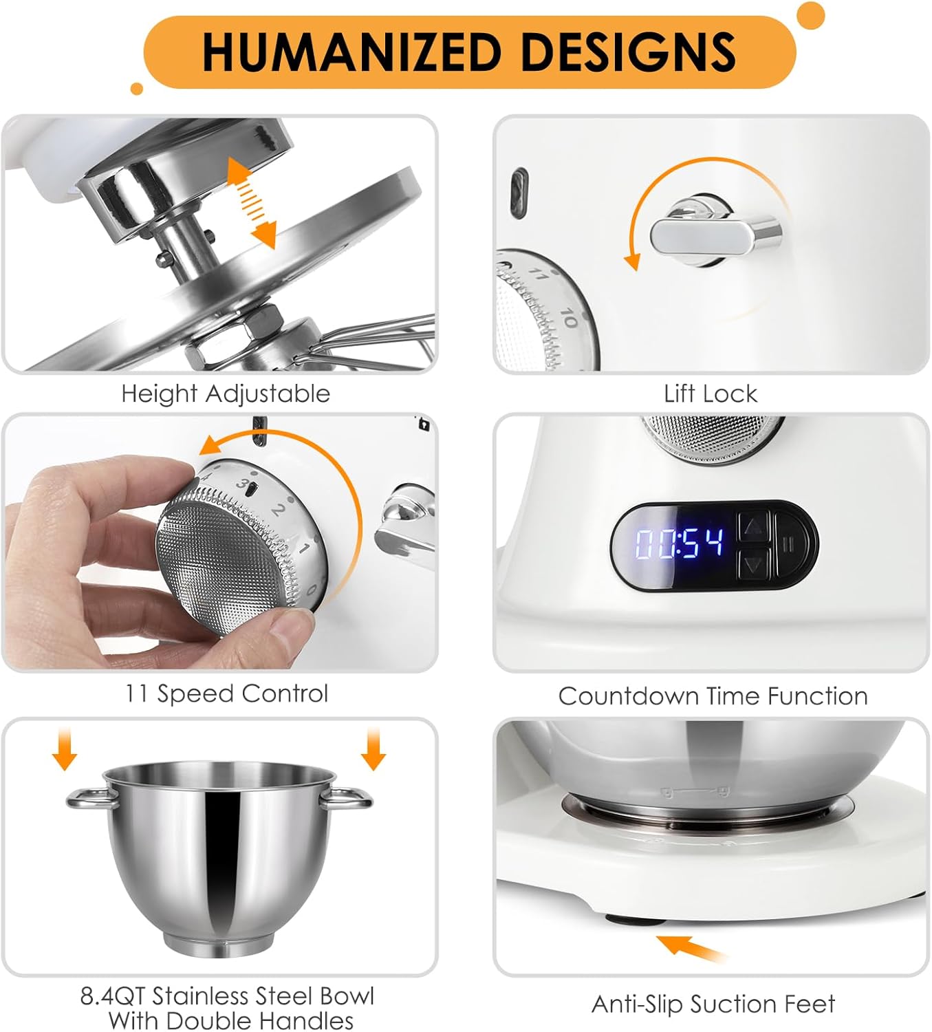 - Multiple Accessory Set: This kitchen mixer includes a set of food-grade stainless steel accessories - a dough hook, wire whip, flat beater, and 8.4QT stainless steel bowl. Dishwasher safe. The adjustable height design accommodates both large and small batches with ease. Perfect for making frosting, meringues, creamy dressings, cake, pizza, cookies, sourdough bread, and more, it's an essential addition to any kitchen.