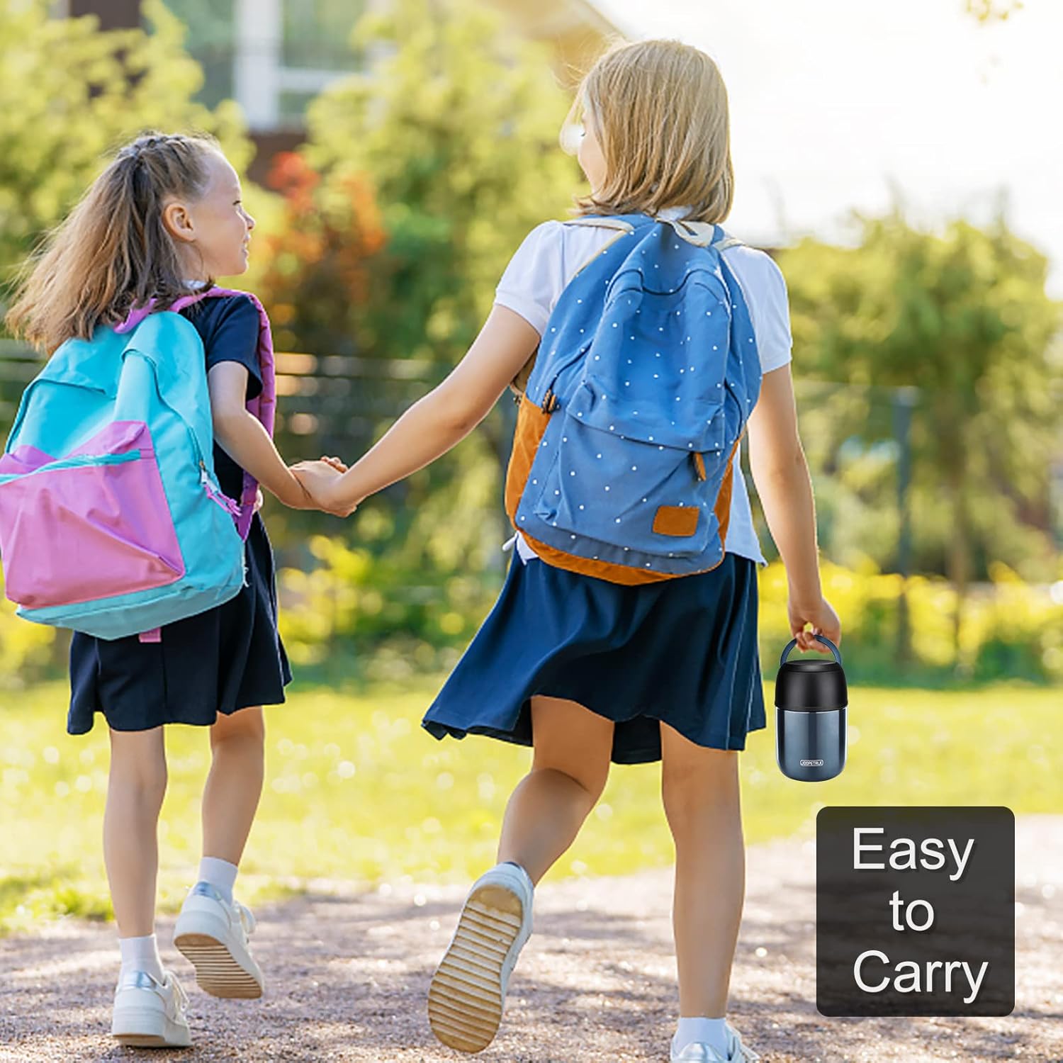 - Our insulated food jar has a unique hidden handle that can reduce the volume of the jar and save more space for you. It fits perfectly in school bags and boxes. The hidden handle could also avoid accidentally opening the lid while carrying school bags.