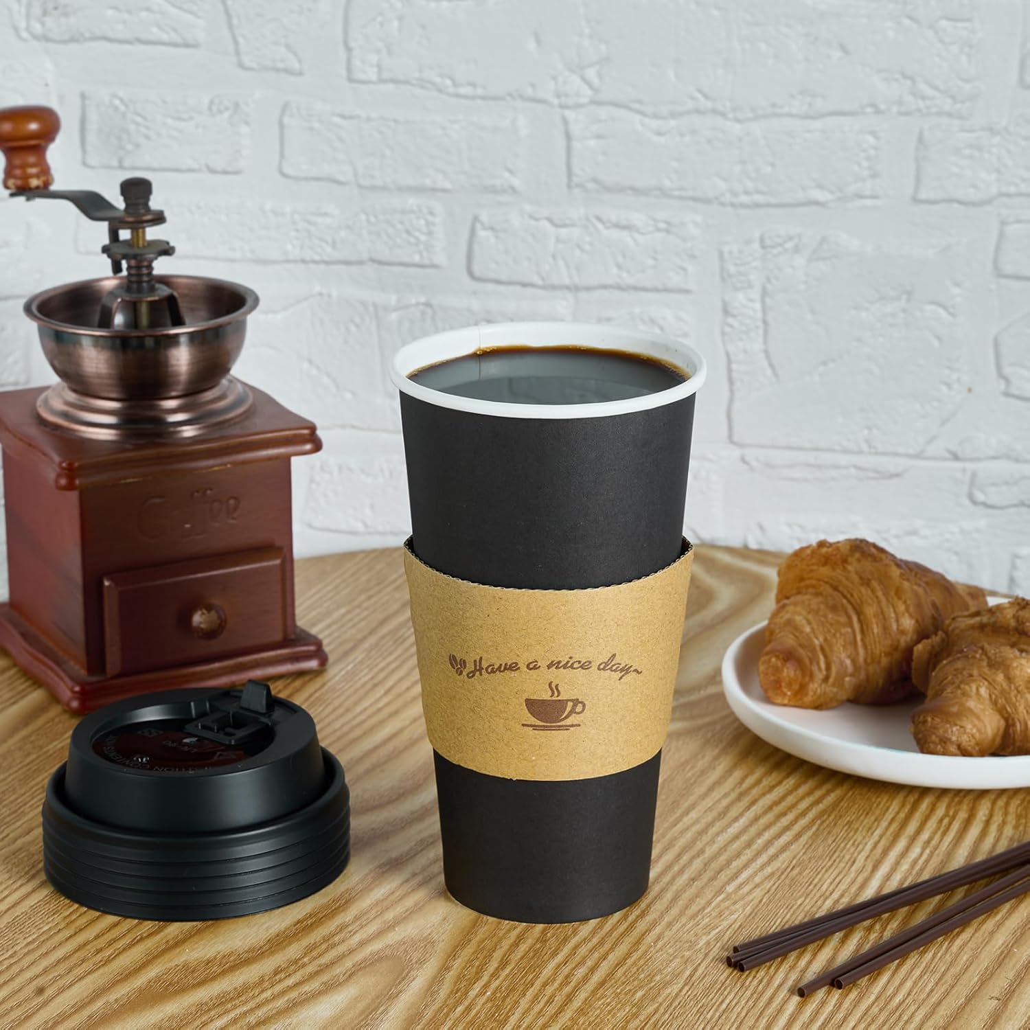 - Great Value Bulk: You will receive 50 coffee cups with black bodies, 50 packs of black matching lids, 50 kraft paper filled cup sleeves, and 50 straws. This set of 20 oz disposable coffee cups has the quantity to meet your family and party needs