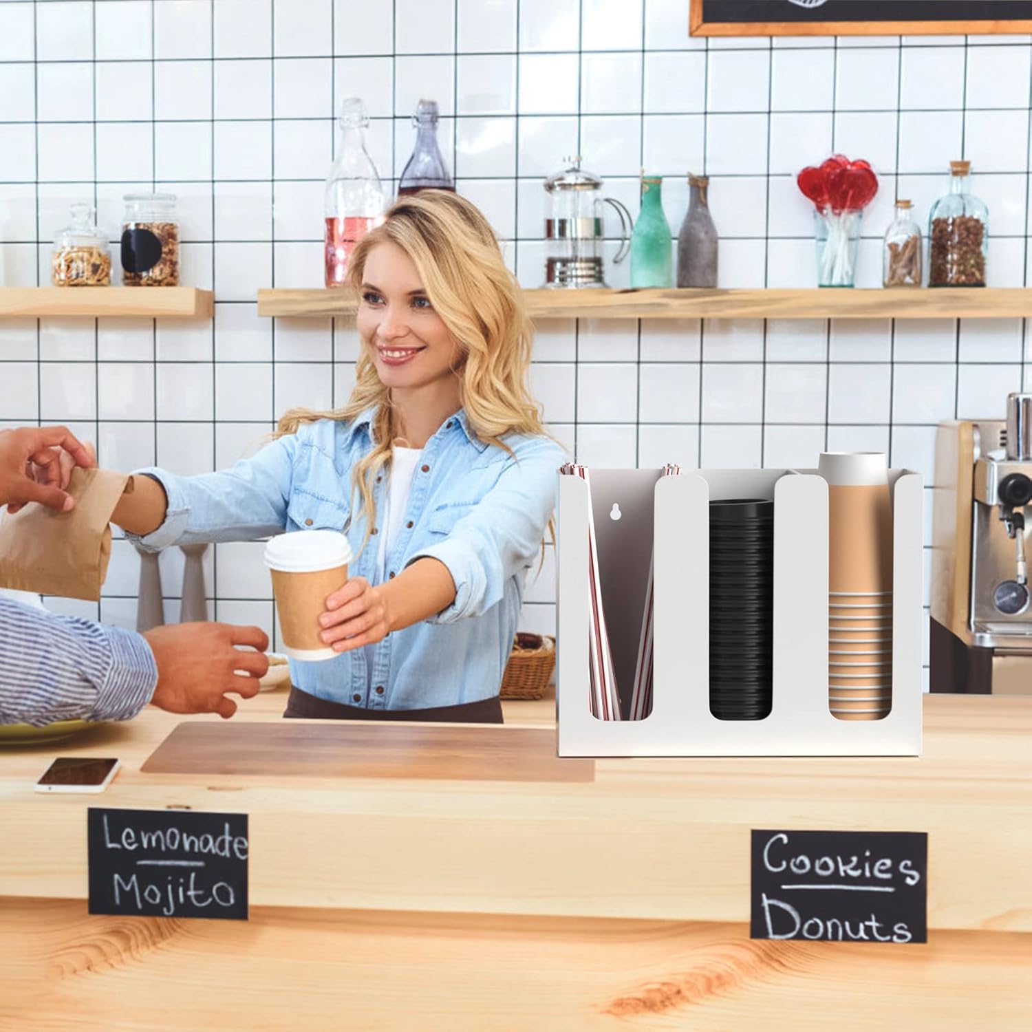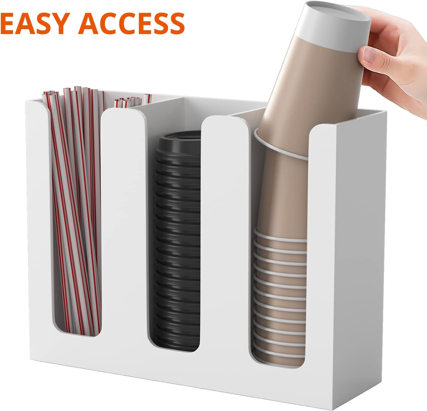 - 3 Section Design - the cup and lid organizer comes with 3 individual section, disposable cups and lids, coffee tea condiments can be storaged separately without any mess, it won't take much space of your countertop, making it look neater and more organized.
