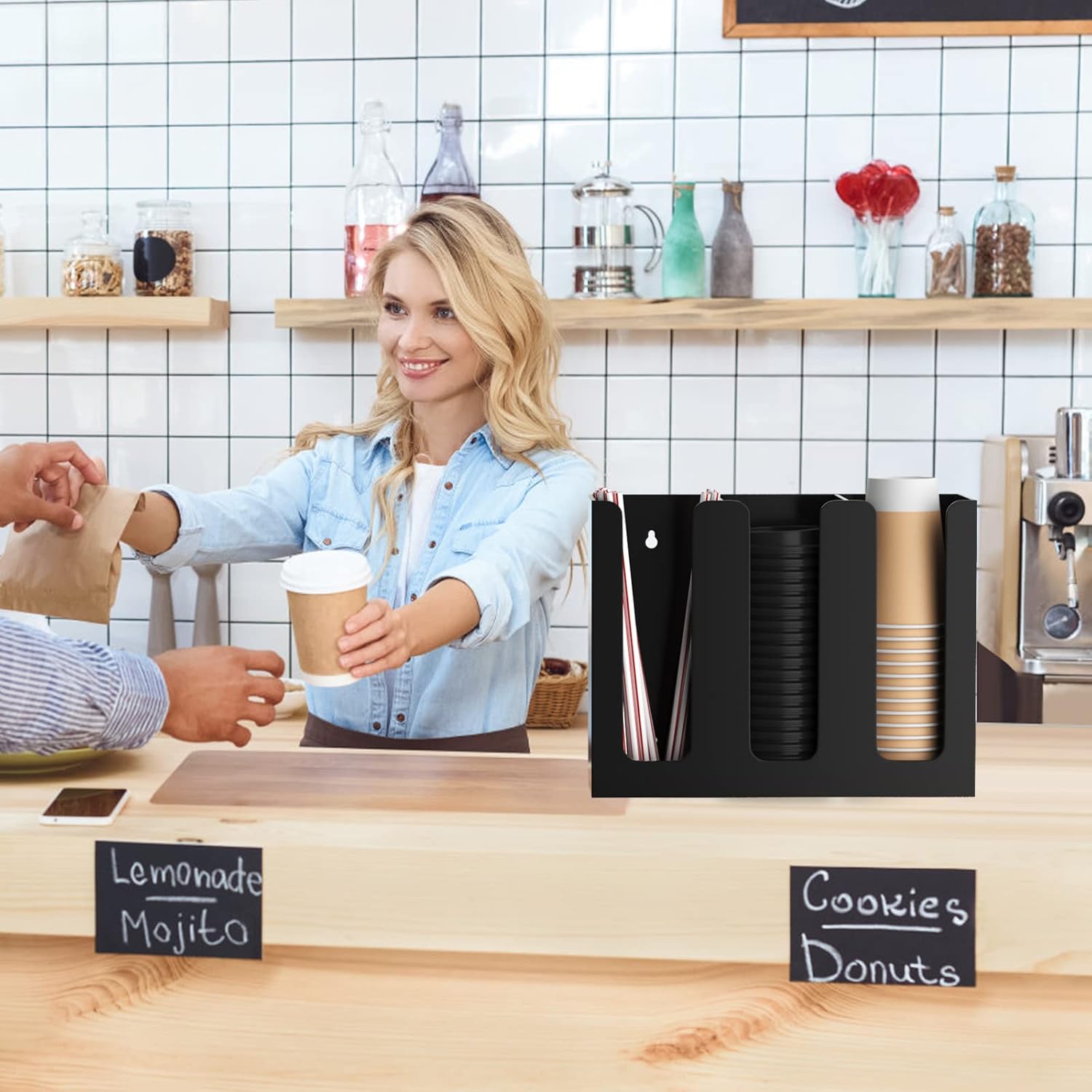 - 3 Section Design - the cup and lid organizer comes with 3 individual section, disposable cups and lids, coffee tea condiments can be storaged separately without any mess, it won't take much space of your countertop, making it look neater and more organized.