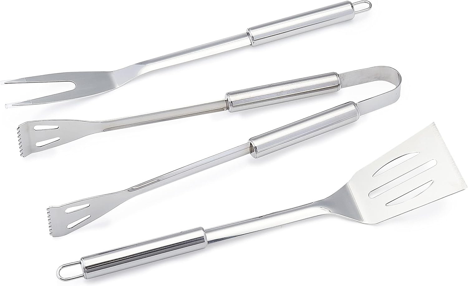 - Includes a spatula, a grill fork, a pair of tongs, and a cloth storage bag