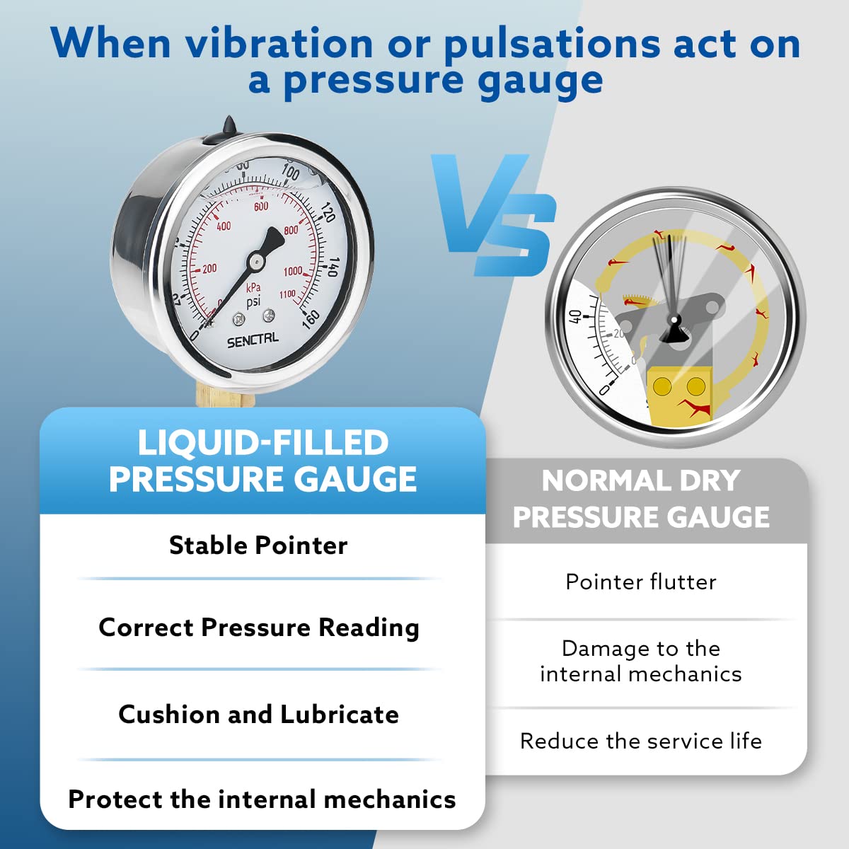 SENCTRL 0-160 Psi Glycerin Liquid Filled Air Pressure Gauge, 2.5" Dial Size, 1/4" NPT Lower Mount, Stainless Steel Case, Water Pump, Tire, Large Air Compressor, Well Pump, RV Regulator Pressure Test