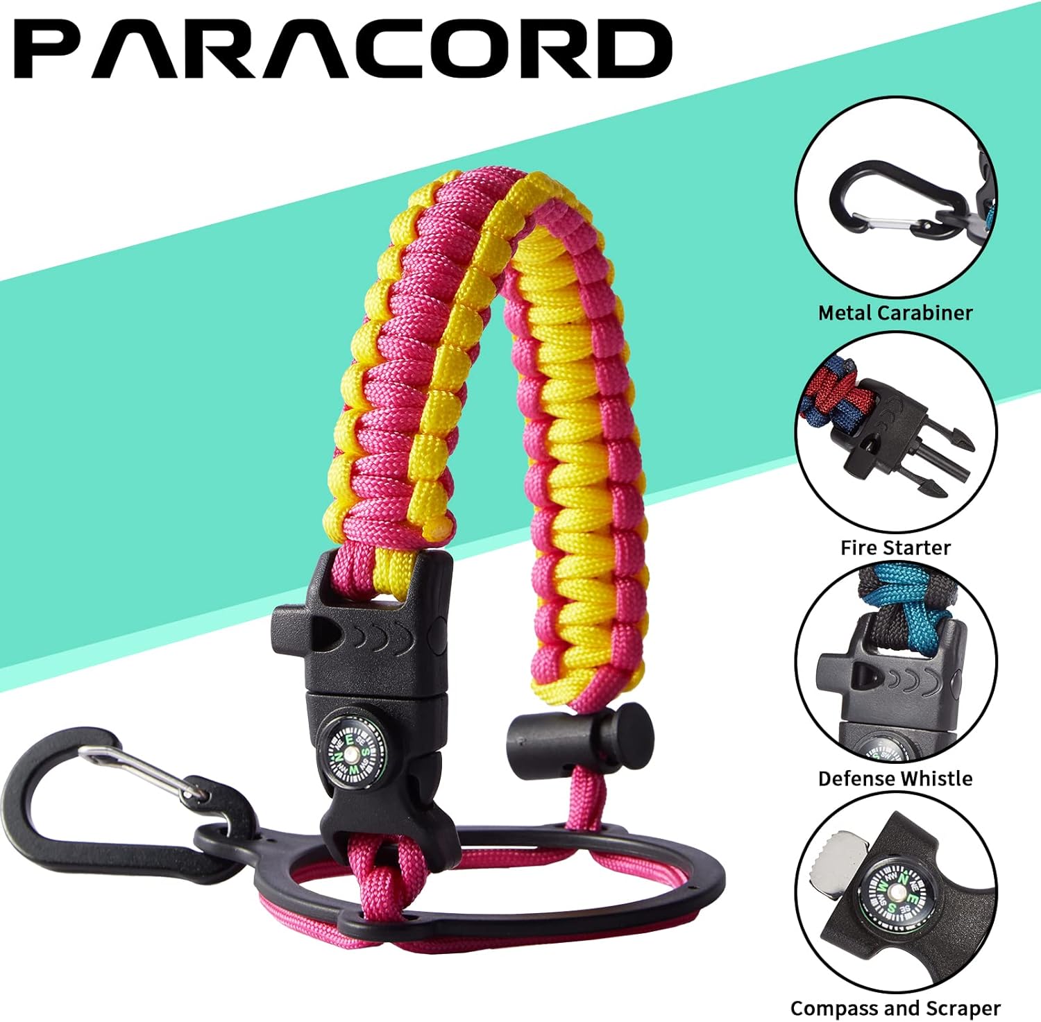 - UNIQUE DESIGNS PARACORD HANDLE: Full-function paracord handle made in individual styles to match the color of the flask water bottles. With compass, safety ring, carabiner, flint fire starter & whistle. It unravels into a sturdy and taut rope in an emergency, making the large water jug an ideal survival kit for expeditions in the wild