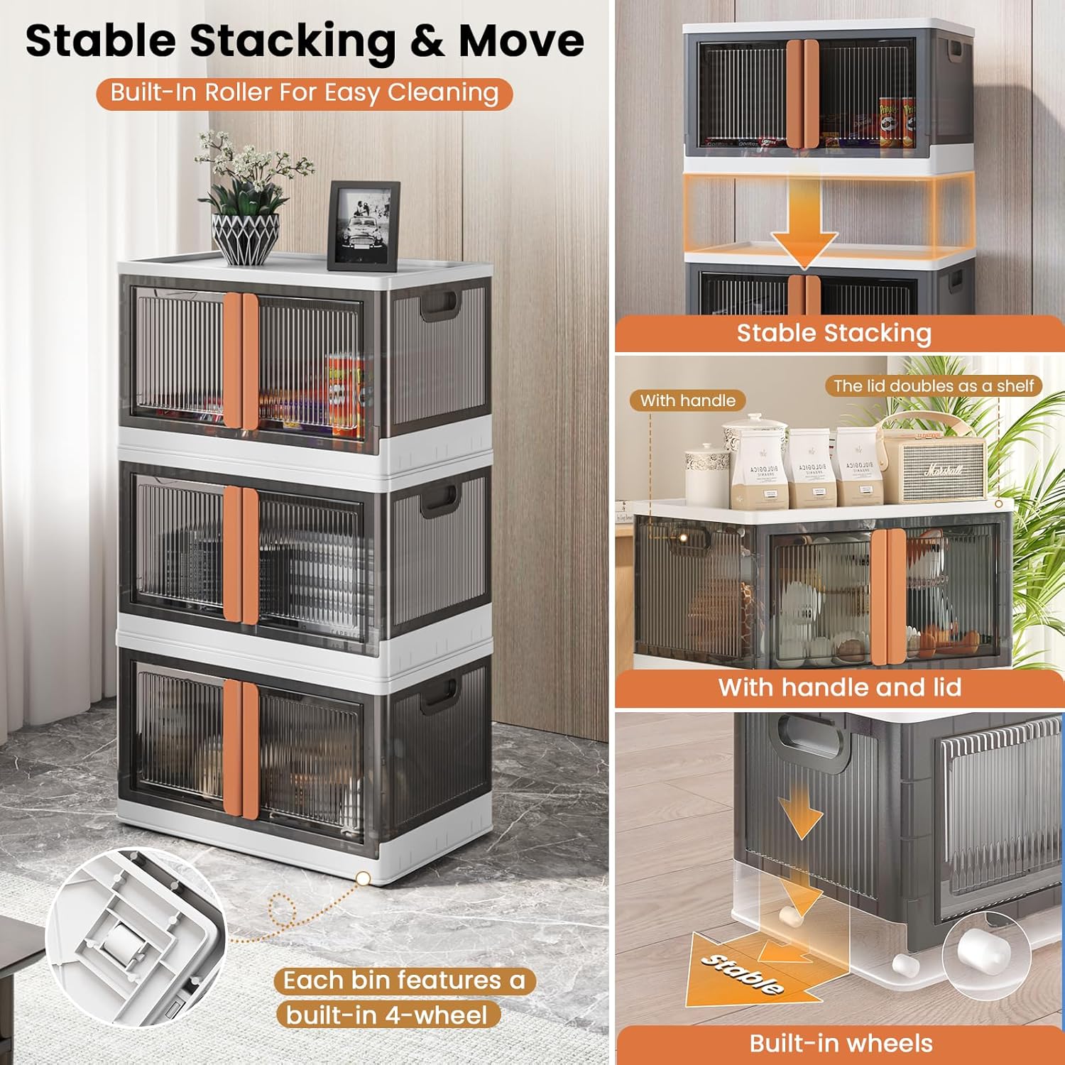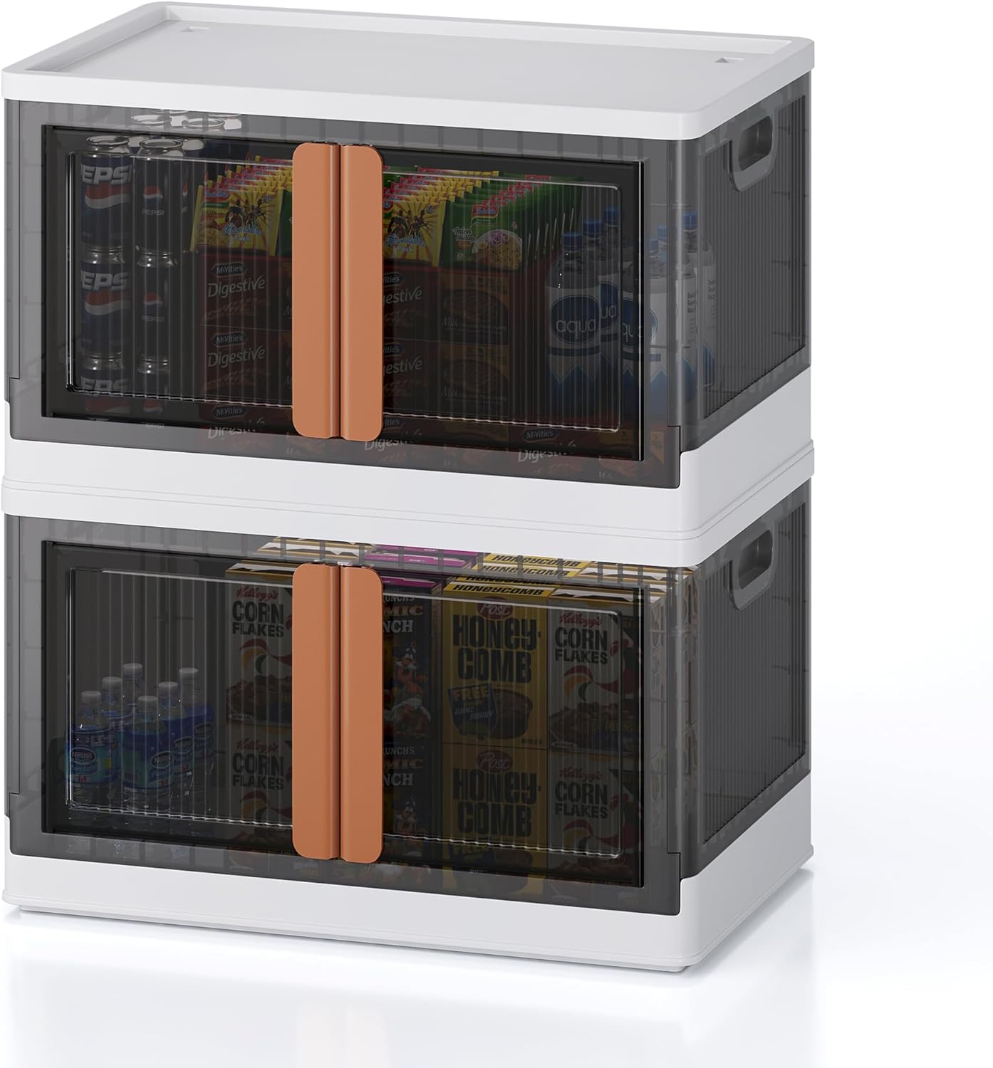 19Gal Collapsible Storage Bins with Lids & Wheels - 2 Pack Stackable with Doors, Heavy-Duty Plastic Containers for Home/Office, White