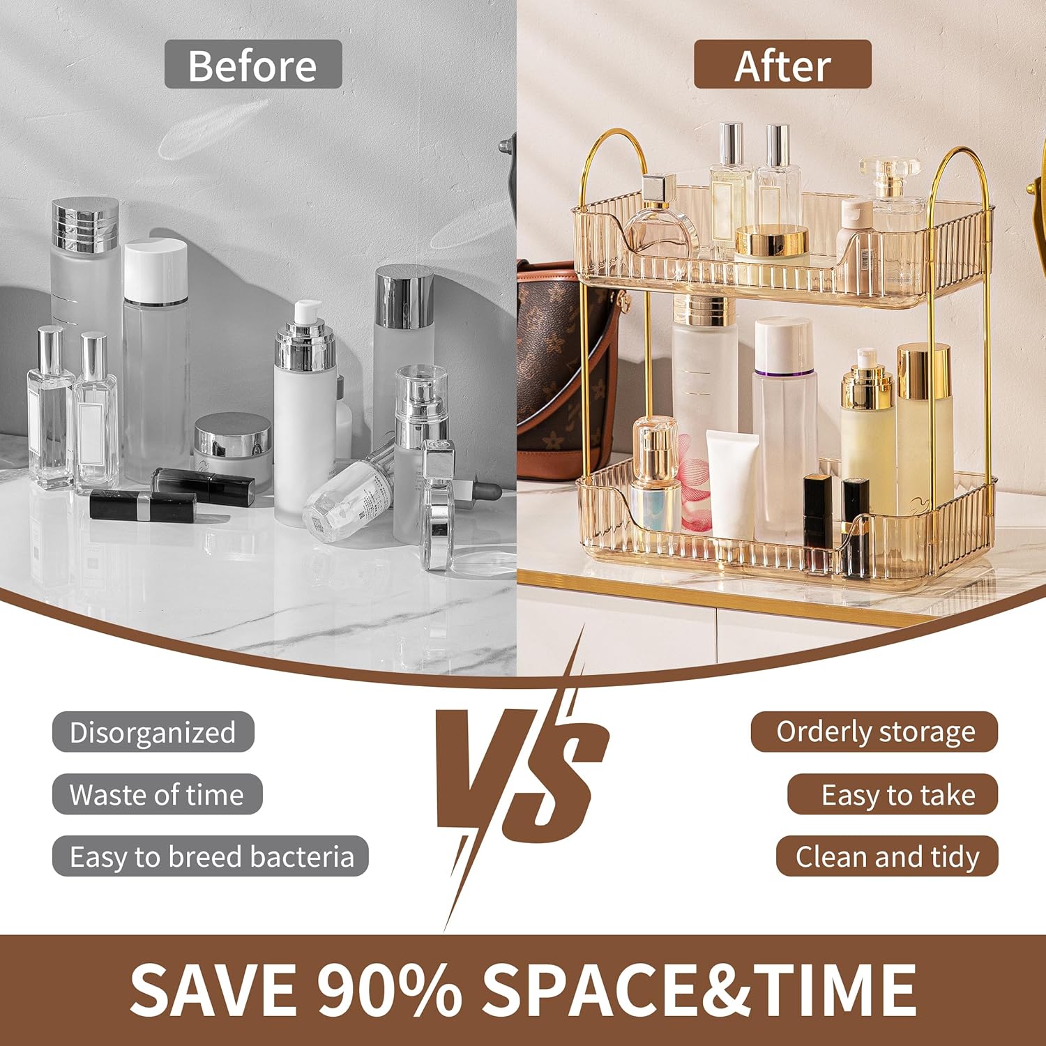 YCIA&DONE Bathroom Organizer Countertop, Makeup Storage, Skincare Cosmetic Tray Shelf, Perfume Holder Rack for Vanity Counter, Large Capacity, Easy to Install, Clean, 2 Tiers, Amber Gold