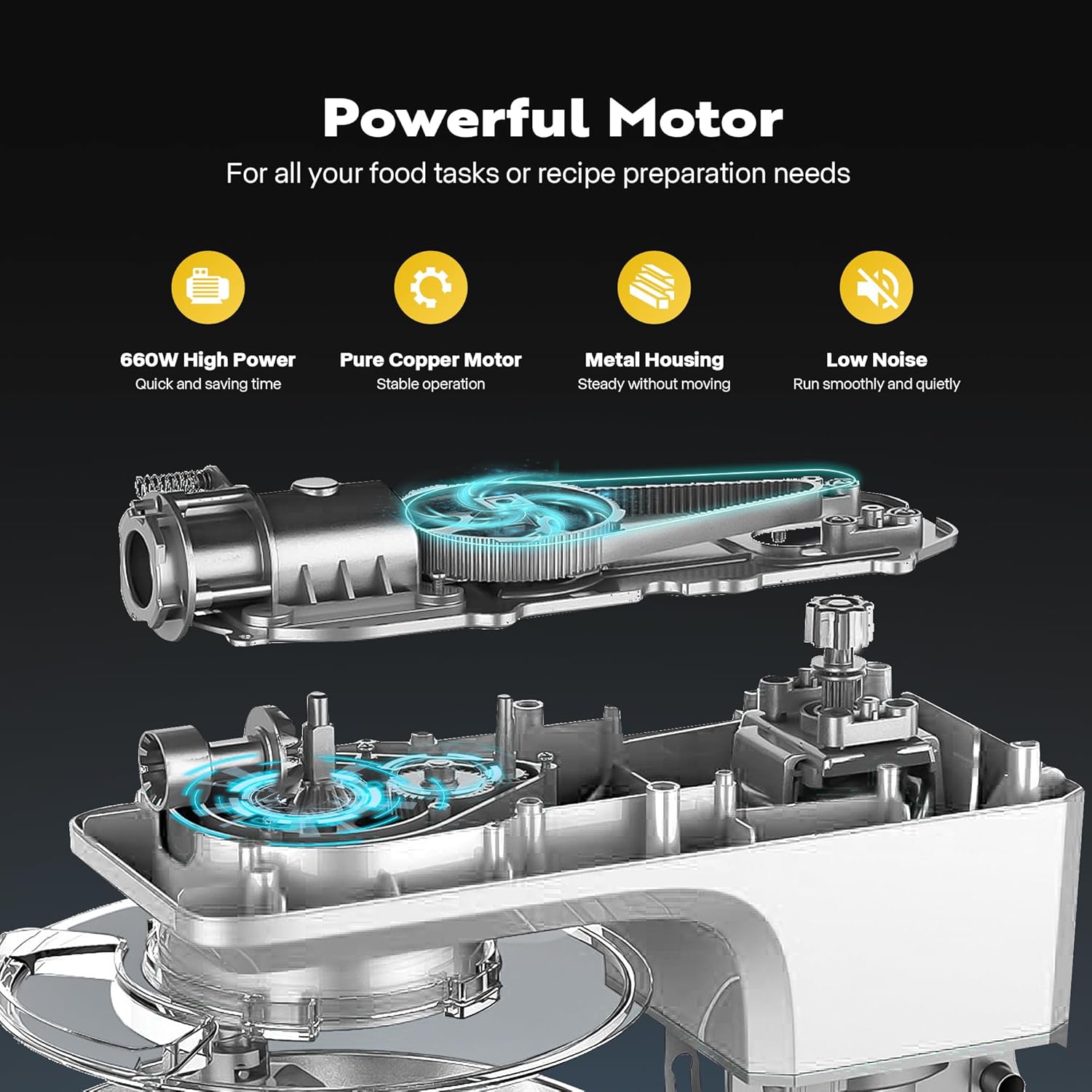 - POWERFUL MOTOR - With a high-performance 660W motor, the stand mixer finishes kneading and mixing more quickly and thoroughly than human hands. Handy 6-speed control with a pulse function is designed for all your food tasks or recipe preparation needs