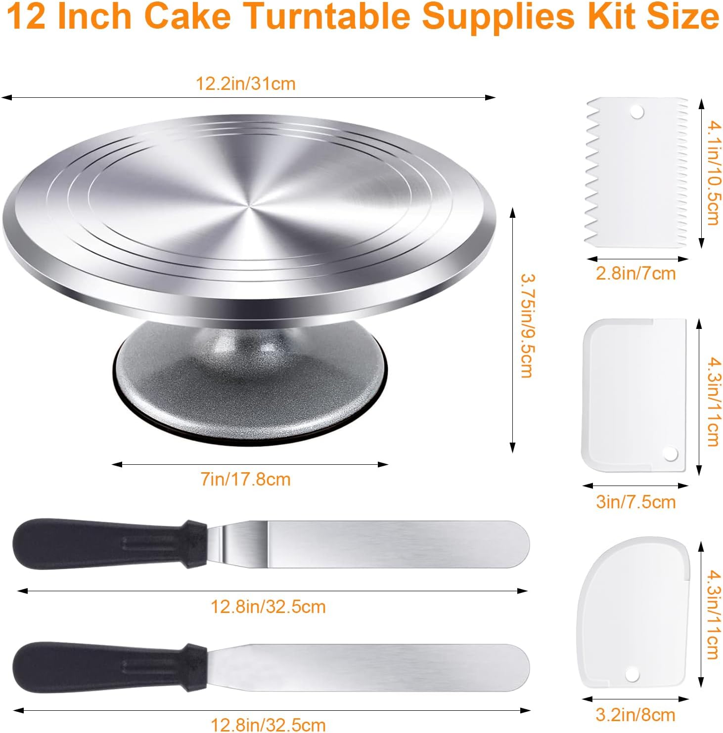 - 【Premium & Rotation Design】The cake decorating turntable is made of premium heavy duty aluminum alloy to better prevent the cake stand from moving, overall safe, non-toxic and durable. This cake stand can perfectly carry 12inch/30cm cake, apple pie. 360° Rotation design, smooth and silent, no matter left hand or right hand can be used well.