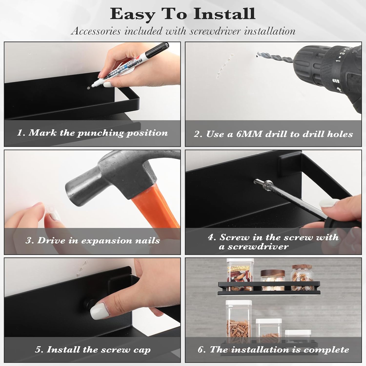- Simple to Install: shower caddy black comes with installation accessories, you need to drill the holes first, then drive in the plastic expansion strips, screw in the screws with a screwdriver (not included), install the hidden cover, and the installation is complete; Hidden covers help hide screws for a more esthetical and pleasing look, both decorative and practical