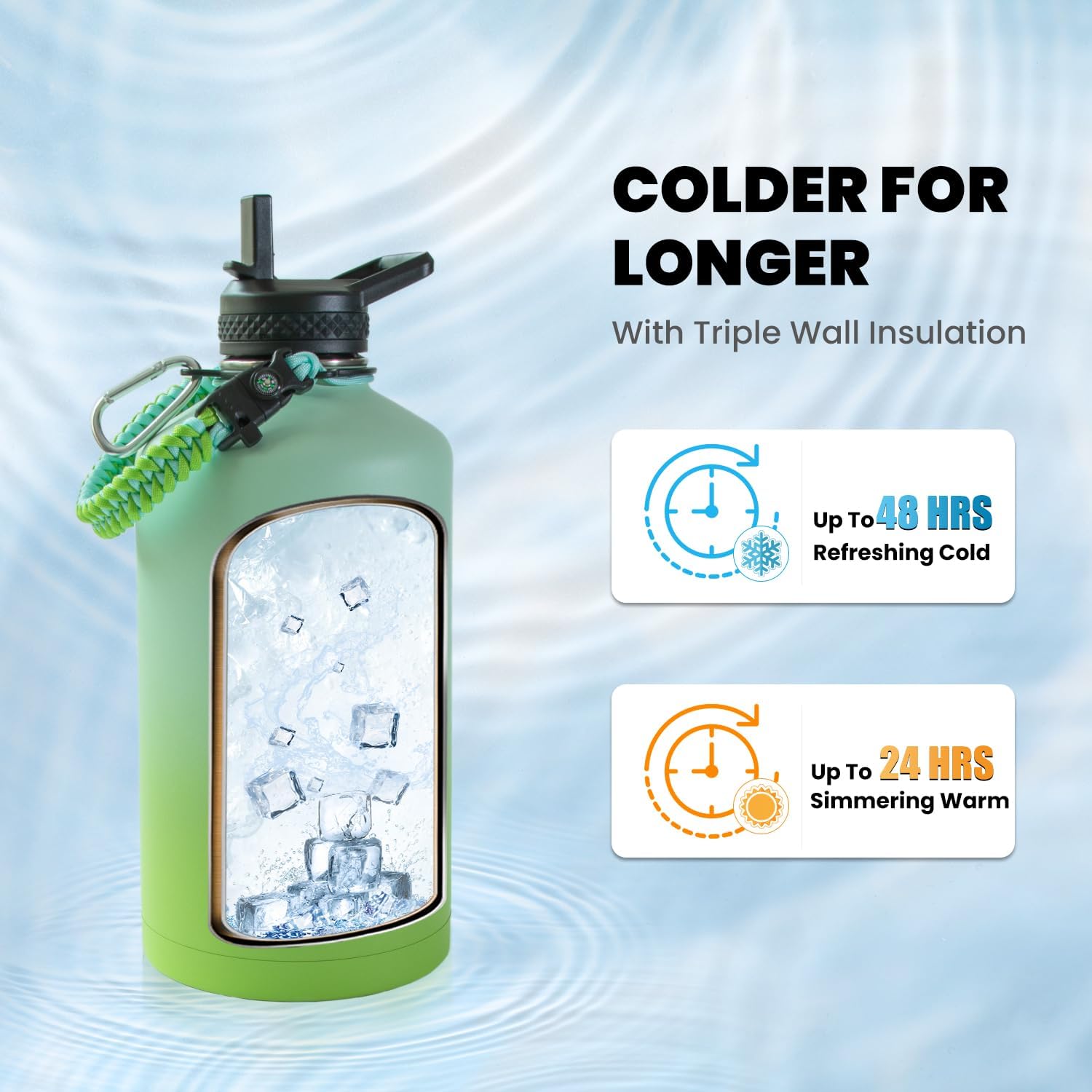 - Triple Wall Insulation: Raymylo 128 oz One Gallon Insulated Water Bottle featuring copper plated triple wall vacuum insulation, is tested to keep your drinks icy cold for up to 48 hrs and reassuring warm 24 hrs. Get this iconic water bottle to up your fitness track, you'll fall for hydrating as every sip is absolutely cool