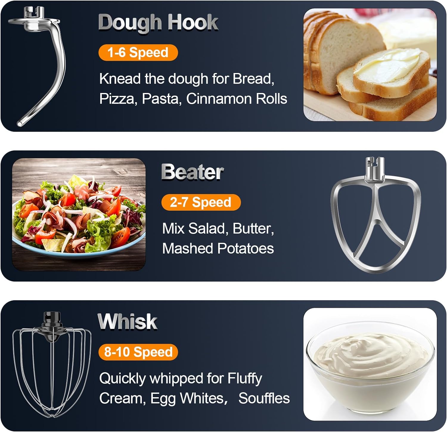 - 【Low-Noise & Overheating Protection】 Utilizing Aerodynamic Theory to reduce the resonance of the cook mixer's internal chamber, with high quality bearing parts, resulting in less than 60 dB of noise. Overheating protection ensures longer dough mixer life.