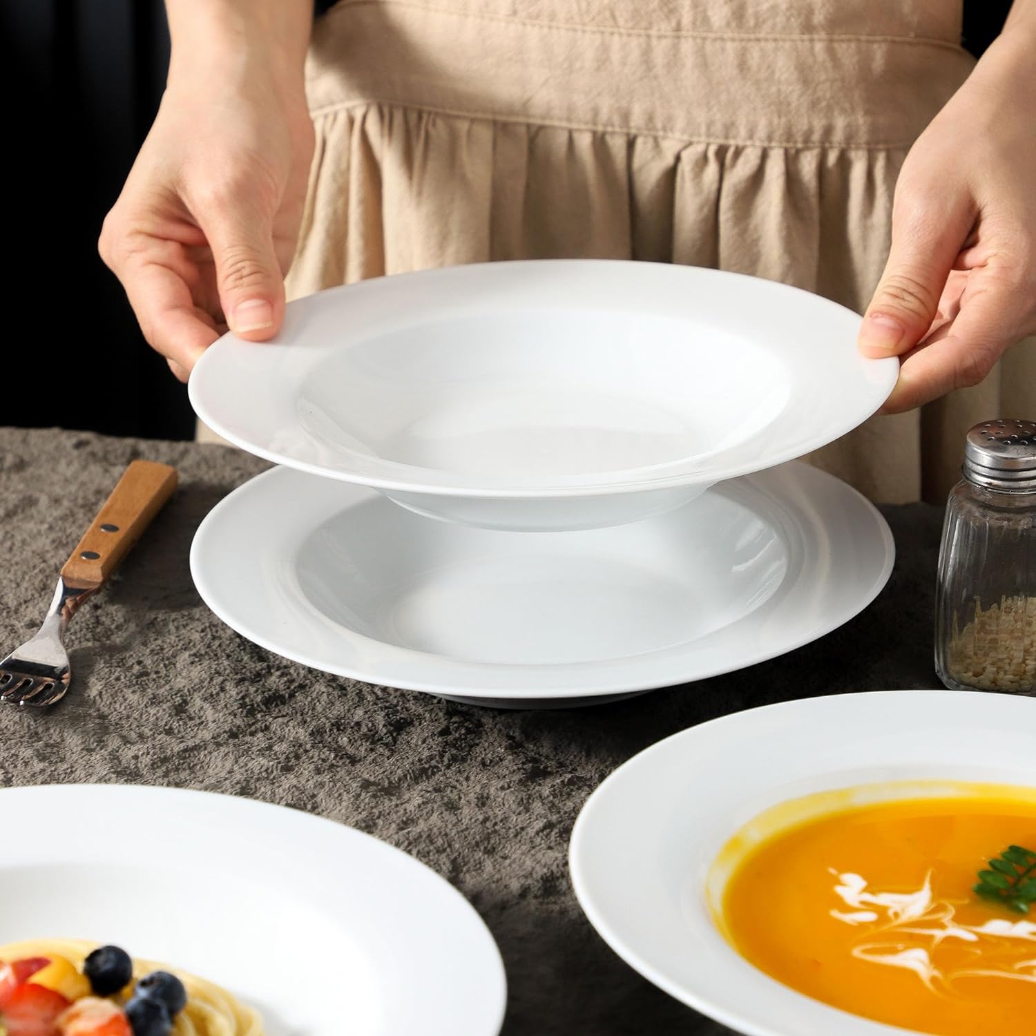 - Minimalist White Plates: Classic white plates are the most popular basic dinnerware in the kitchen. The solid white color allows you to use these pasta bowls for fancy dinner for serving everyday stuff. Easy to showcase the food and there is no worry about staining