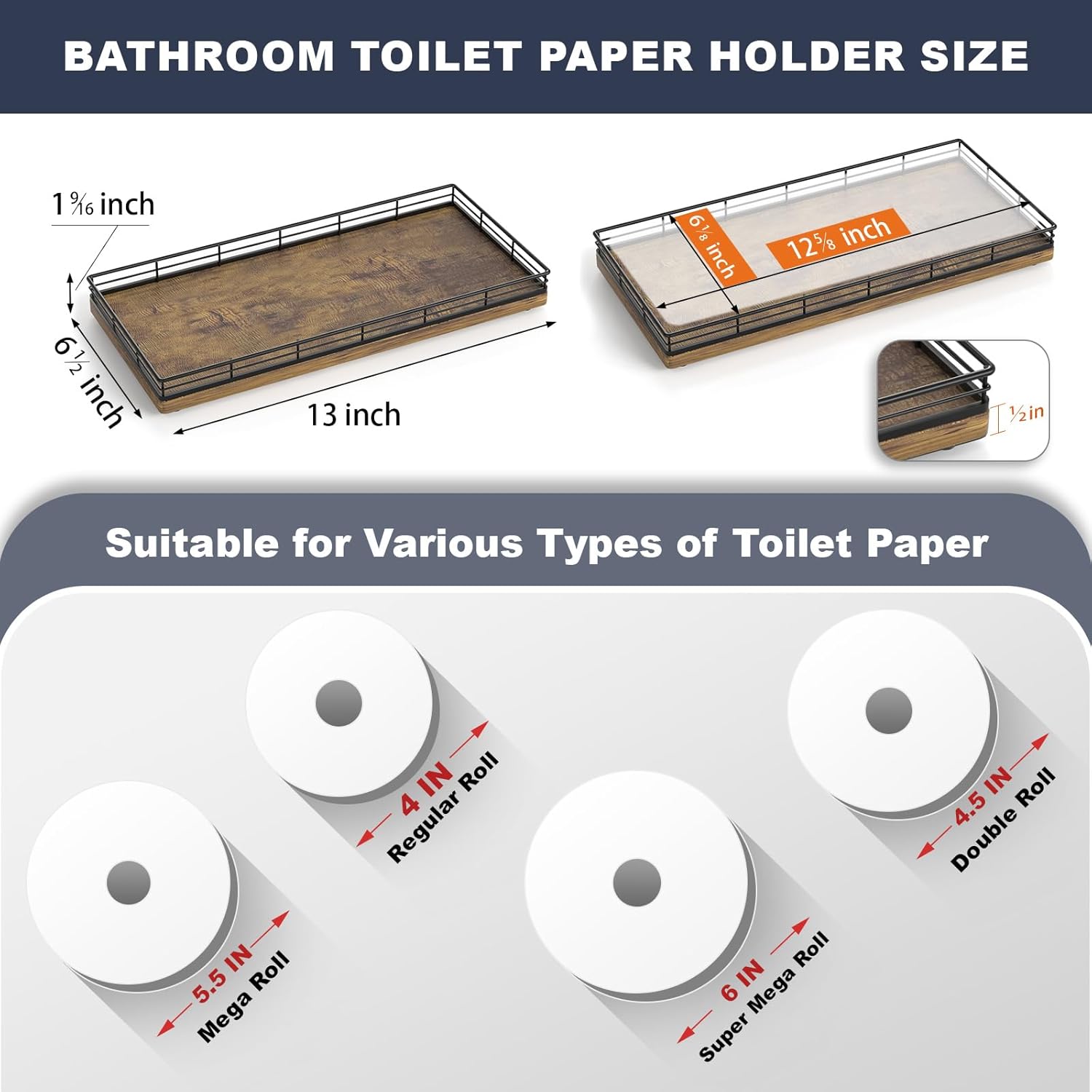 - Unique Charm: This 13 inches large wood rectangle toilet tank tray ensures durability and increased load-bearing capacity; Elevate your space with a unique appearance featuring a combination of iron mesh edges and rustic brown wood board; Distinctive and captivating grain pattern adds an exquisite touch of elegance and sophistication; This bathroom toilet organizer tray blends modern minimalism with farmhouse charm seamlessly