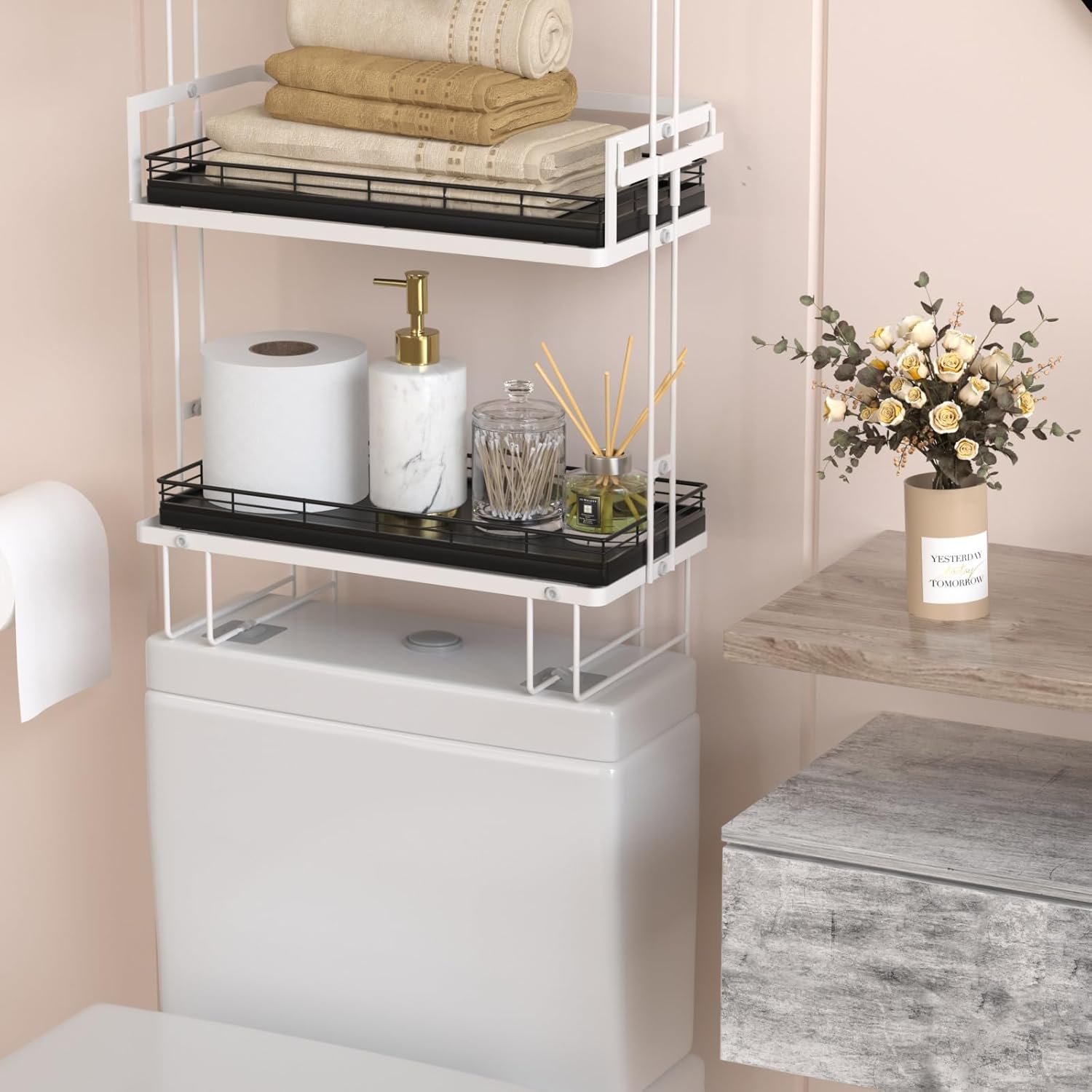 - Versatile Functionality: Elevate your daily routine with our toilet tank basket tray; Neatly arrange bathroom essentials such as toilet paper, lotions, scented candles and potted plants, keeping your countertop tidy; Add a touch of elegance to your dresser by using the bathroom vanity tray to display perfumes, jewelry, and cosmetics; Impress your guests with neatly arranged hand towels and toiletries organized on the large toilet tray for bathroom counter or use it as a kitchen soap tray