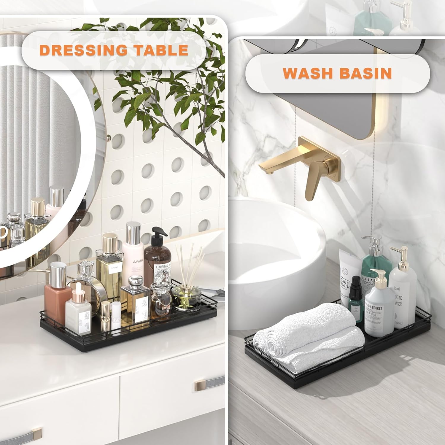 - Considerate Design: This bathroom trays for counter is ready to use without any installation required; Upgraded embedded welding design enhances stability and aesthetics; Raised edge prevent items from slipping; 4 non-slip pads on the bottom protect surfaces from scratches; Simplify your cleaning routine with just a quick wipe-down using a damp cloth, saving you time and hassle