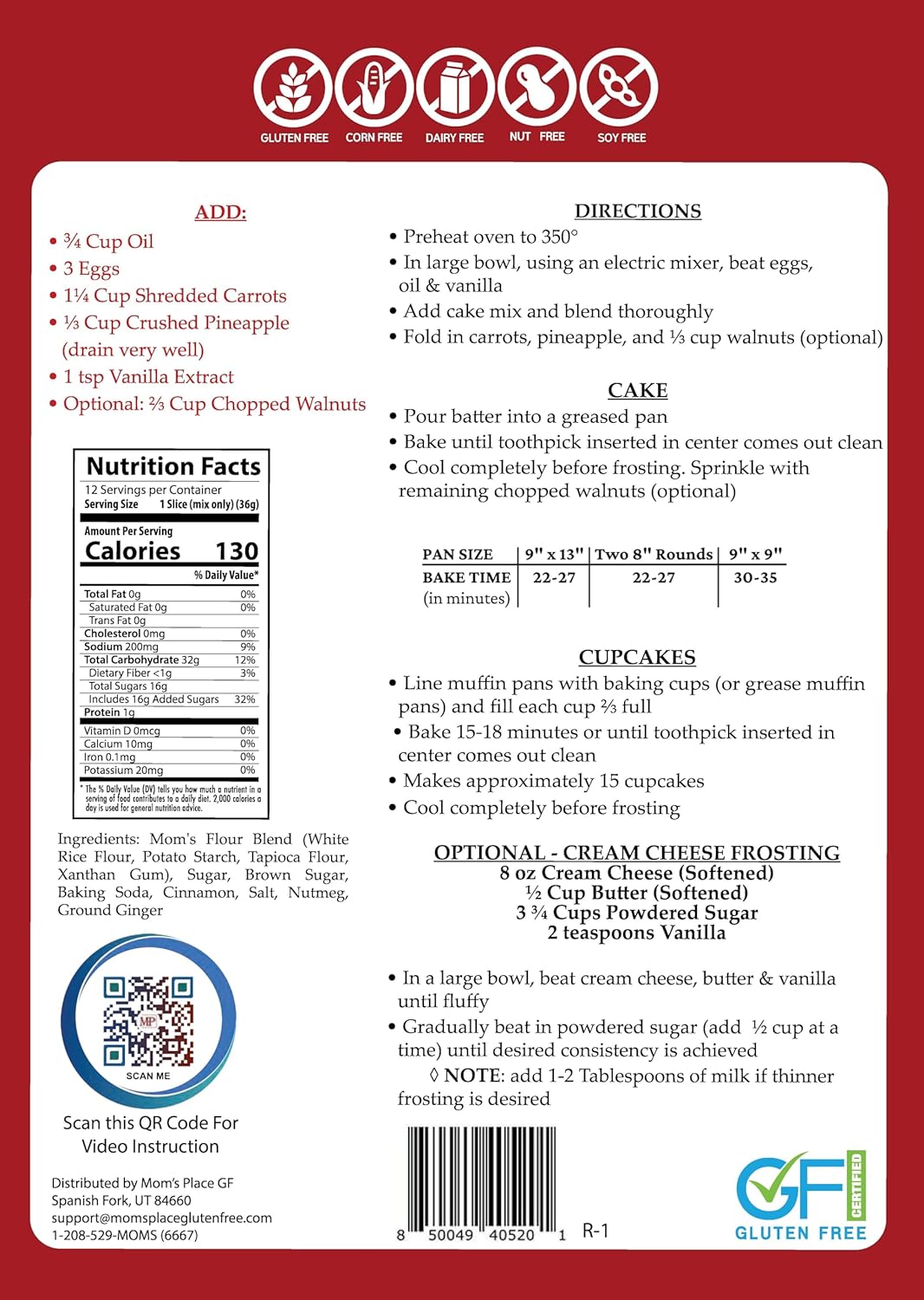 Mom's Place Gluten-Free Carrot Cake Mix – Moist, Spiced, and Dairy-Free – Allergen-Friendly, Non-GMO, Easy to Prepare 15.3 Oz