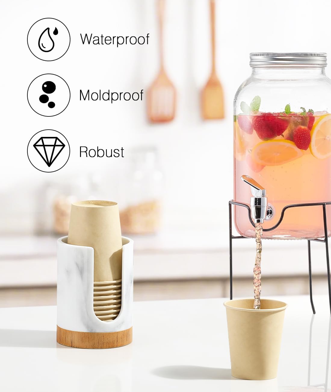 - Keep Cups Tidy: Using a dixie cup holder is better-looking and more sanitary than stacking cups on the table. With all the cup openings facing down, the organizer keeps your cup clean and dust-free. The holder also protects cups from water on the bathroom countertop. Classy marble and wood pattern, giving a neat and elegant look to the countertop.