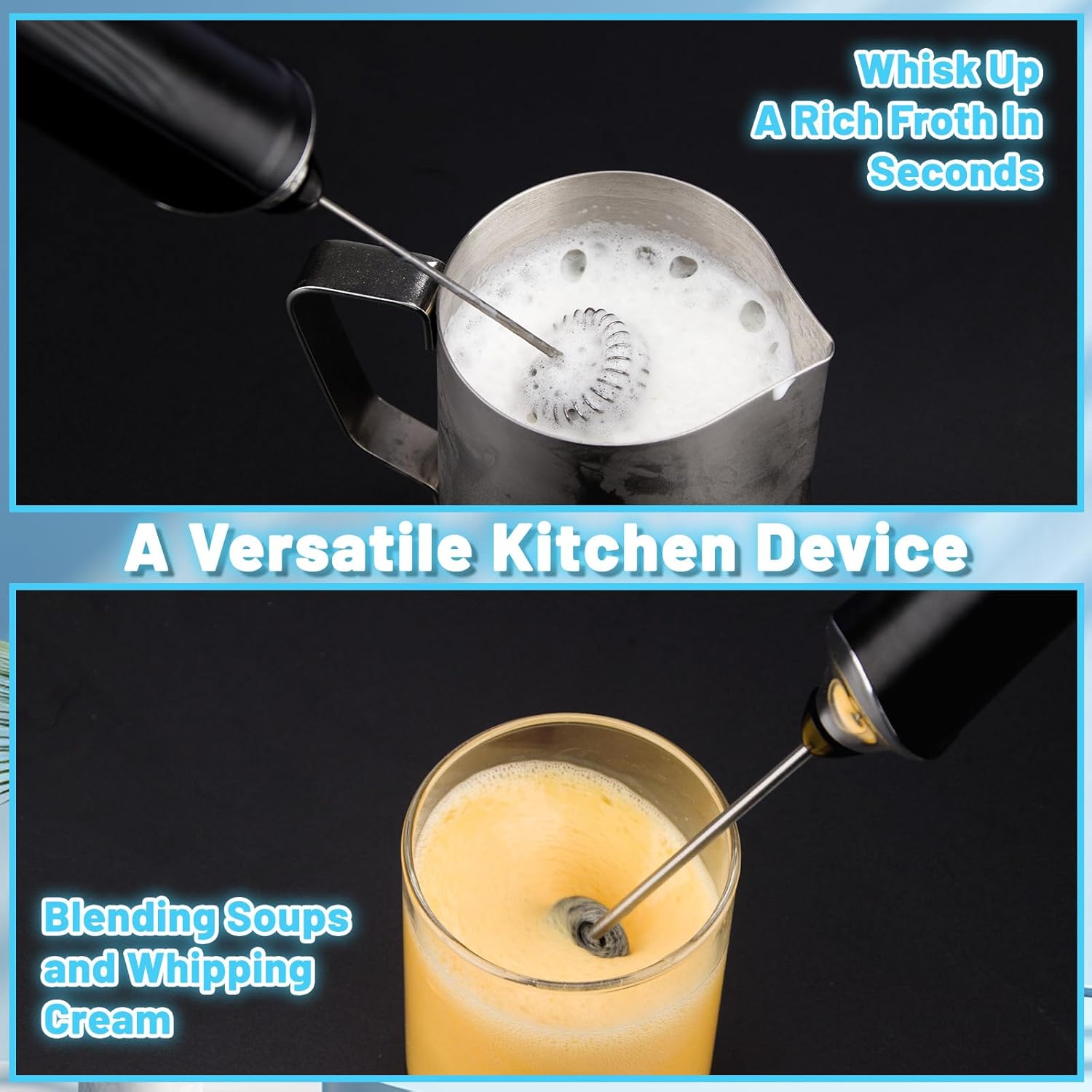 - 【Double 304 Stainless Steel Whisks】: This handheld coffe frother come with 2 premium food-grade stainless steel whisk. One is great for Coffee, Latte, Milk, Hot Chocolate, Drinks, gives that professional finishing touch to your drinks. Another one is great for whisking egg, which is a good helper for baking in the kitchen.