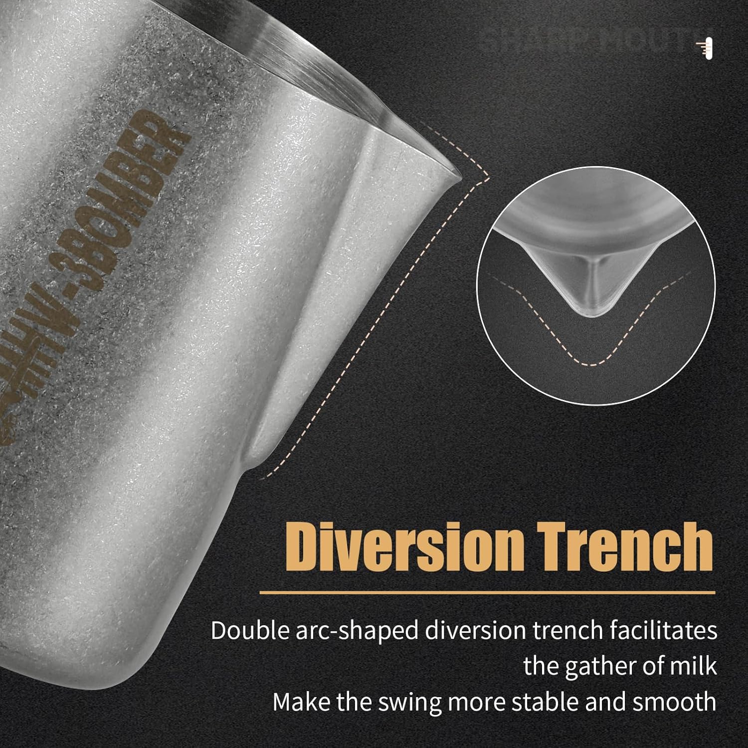 - Double Arc-shaped Guide Grooves: This milk frothing pitcher is equipped with innovative front and rear dual guide grooves design, enhance milk gathering, ensuring a smoother and more stable pour for perfect latte art.