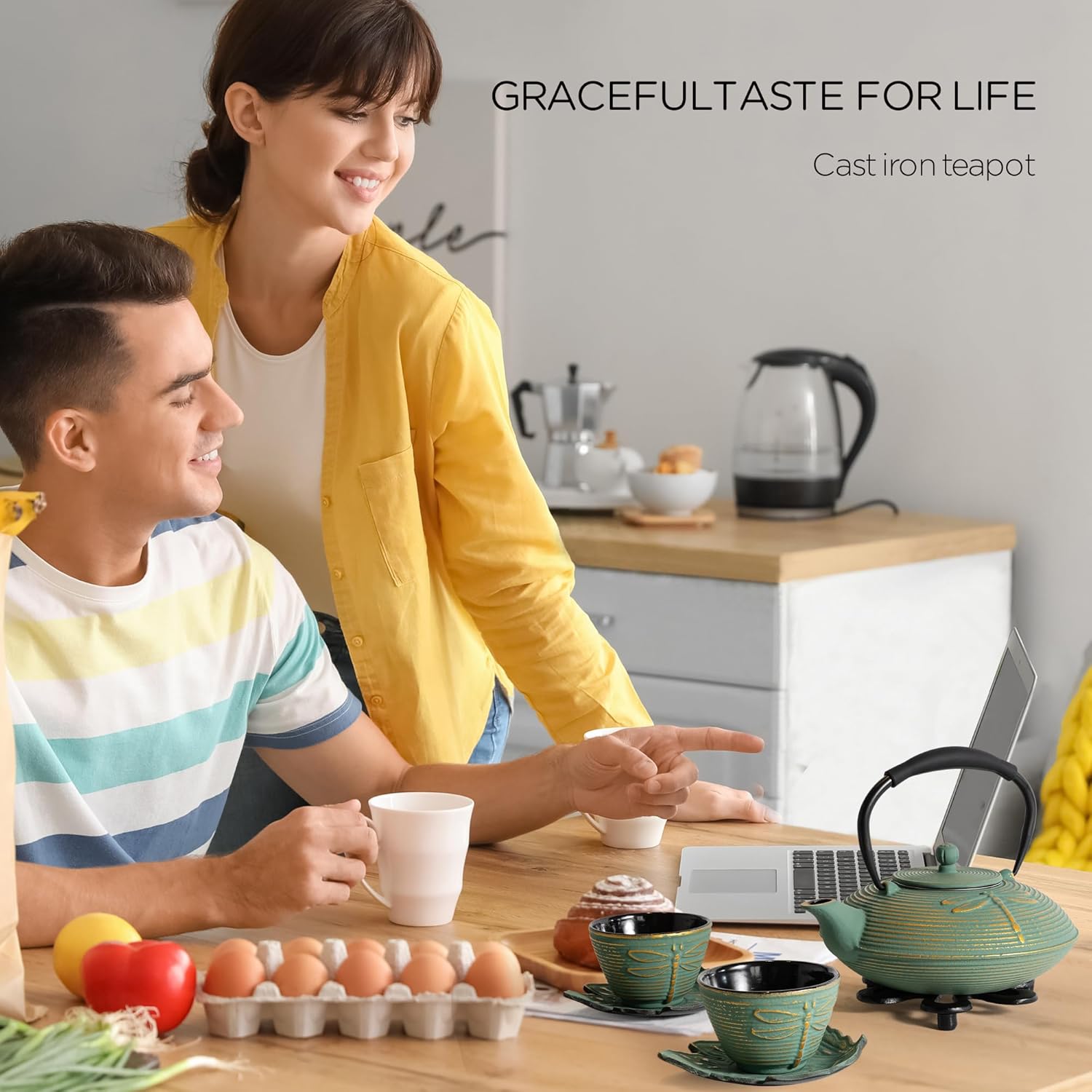 Cast Iron Teapot Set with 2 Tea Cups, 7 Pcs Japanese Tea Kettle with Stainless Steel Infuser, Tea Pot Coated with Enameled Interior, Dragonfly Pattern, 28oz 800ml Green