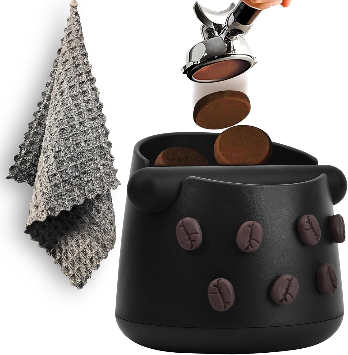 - 【PERFECT CUTE DESIGN】Our Coffee Knock Box, decorated with 7 beautiful coffee beans, includes one 30cm x 30cm 100% cotton barista towels and makes the perfect combination for your coffee machine. The lucky number "7" will bring you good luck in your life, and this perfectly designed espresso accessories also adds a touch of brightness to your kitchen