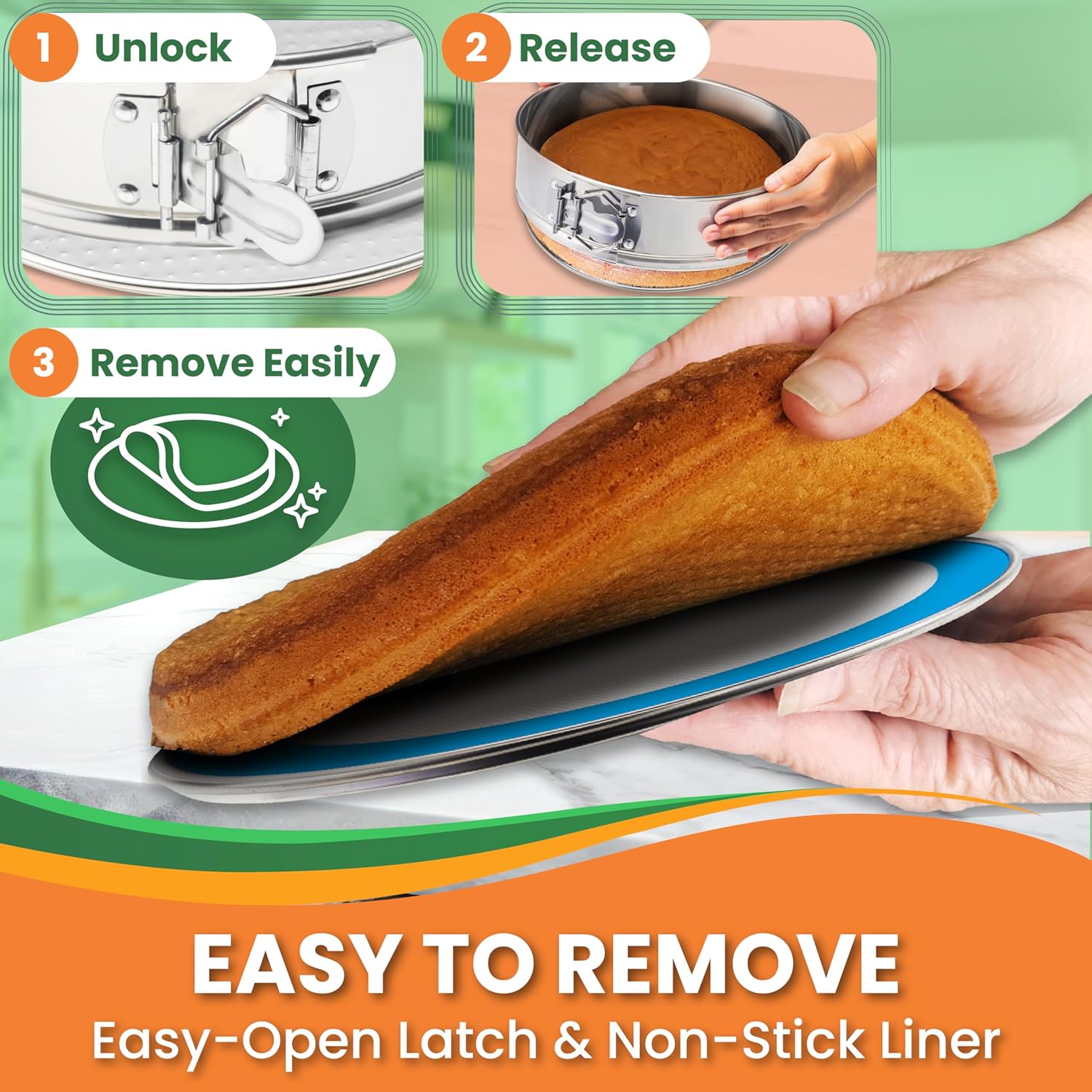 - NATURALLY NON-STICK FOR EASY CAKE RELEASE - The food-grade silicone liner provides a smooth, reusable non-stick surface, eliminating the need for disposable parchment paper and sprays. Enjoy flawless cake removal without harmful chemicals!
