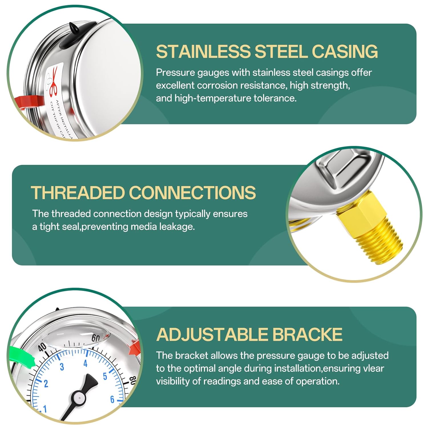 - [MATERIAL FEATURES] 304 stainless steel housing, corrosion-resistant, glycerin filled for stable readings and to avoid vibration damage.