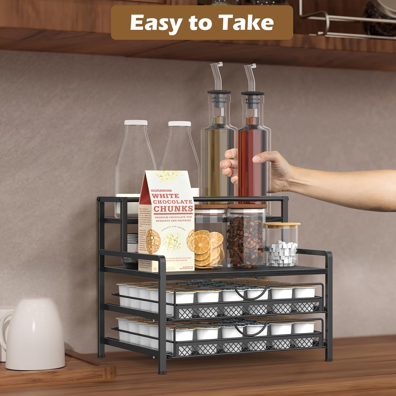 - Space Saving: The coffee pod holder provides extra storage space for your coffee nook to store coffee stuff the coffee syrup holder size 11.4*13.78*12.2 inches,double-layer K cup drawer can hold up to 72 coffee pods of your favorite ,keeps your coffee area neatly organized.