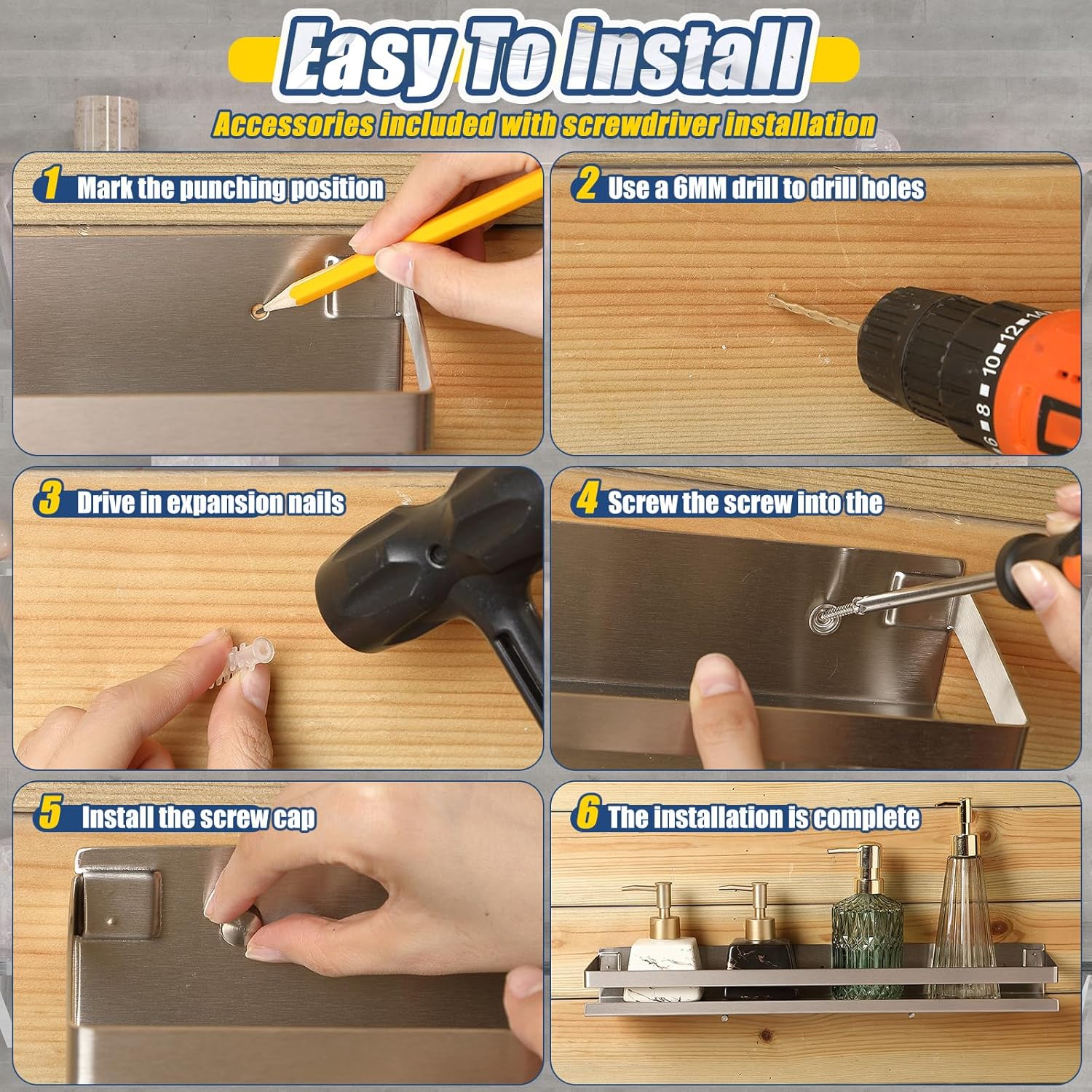 - Simple to Install: shower caddy silver comes with installation accessories, you need to drill the holes first, then drive in the plastic expansion strips, screw in the screws with a screwdriver (not included), install the hidden cover, and the installation is complete; Hidden covers help hide screws for a more esthetical and pleasing look, both decorative and practical