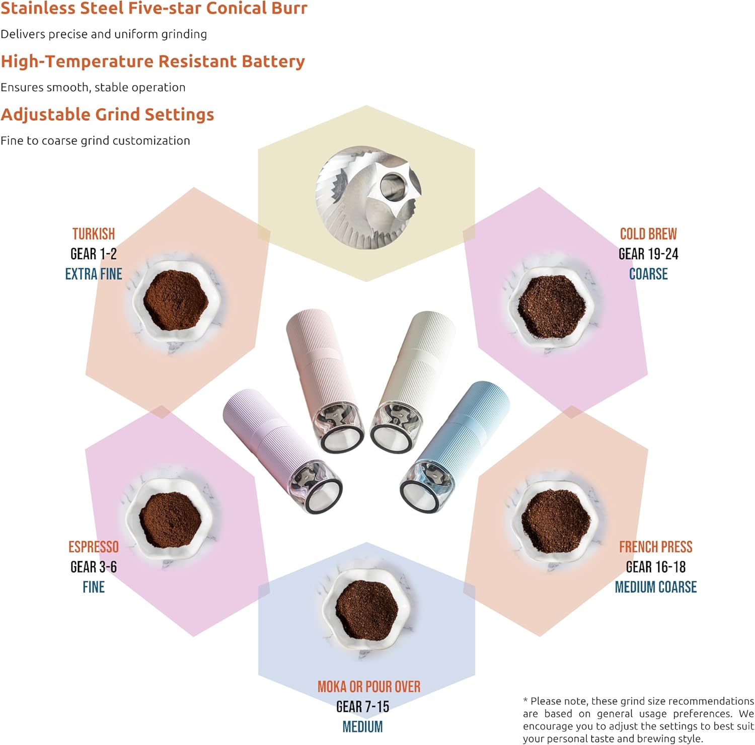- [Stainless Steel Conical Burr, Precision Dual Bearings, Adjustable Grind Settings] The stainless steel five-star conical burr, paired with precision dual bearings, ensures consistent and even grinding, providing you with a personalized and professional coffee experience. With 24+ gears of adjustable grind settings, you can easily switch from fine to coarse, making it perfect for espresso, moka, pour-over, French press, cold brew, and more. Enjoy your perfect cup of coffee anytime, anywhere.