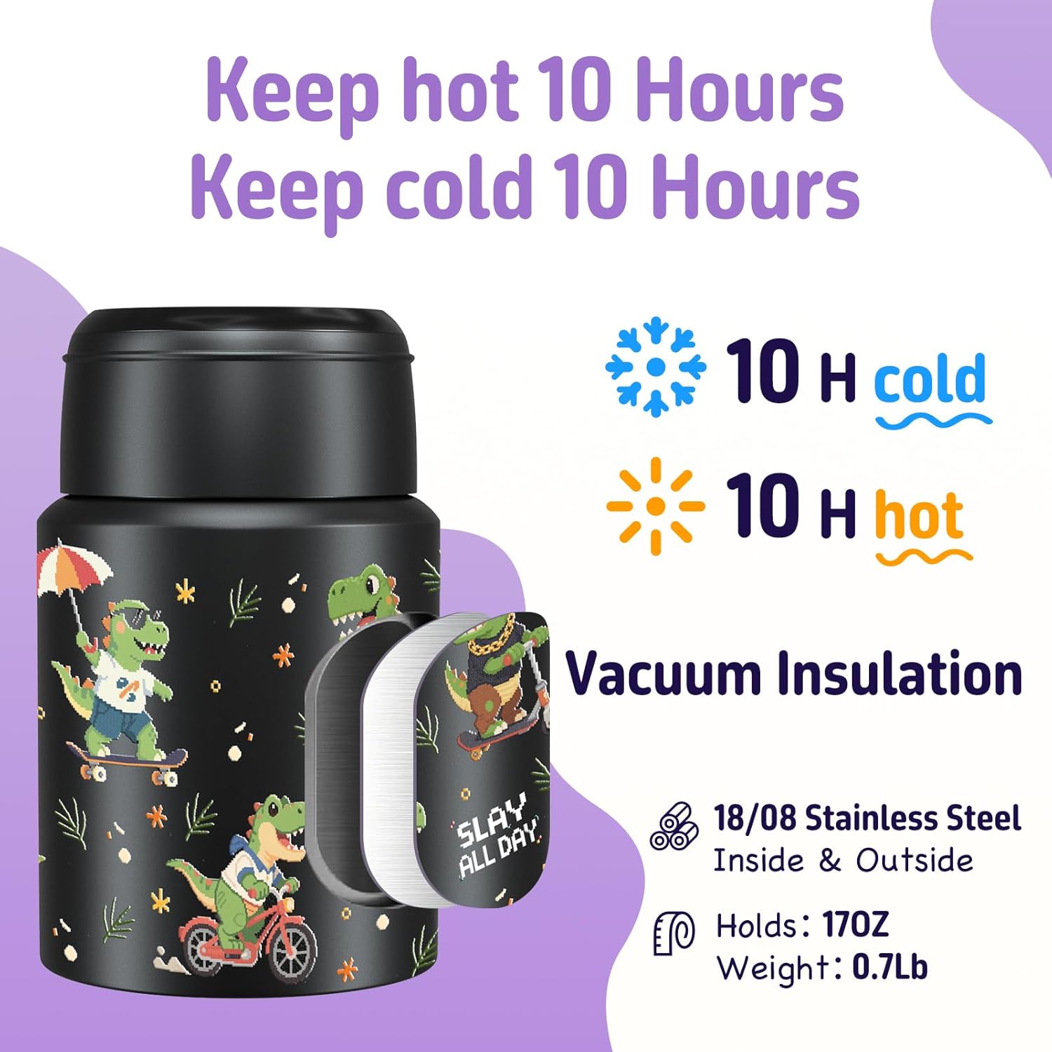 - 【Thematic and practical】This cute premium Dinosaur themed food insulated jar is both loved by kids and offers features suitable for adults. Lightweight and compact, it's easy to fit in your lunch bag.