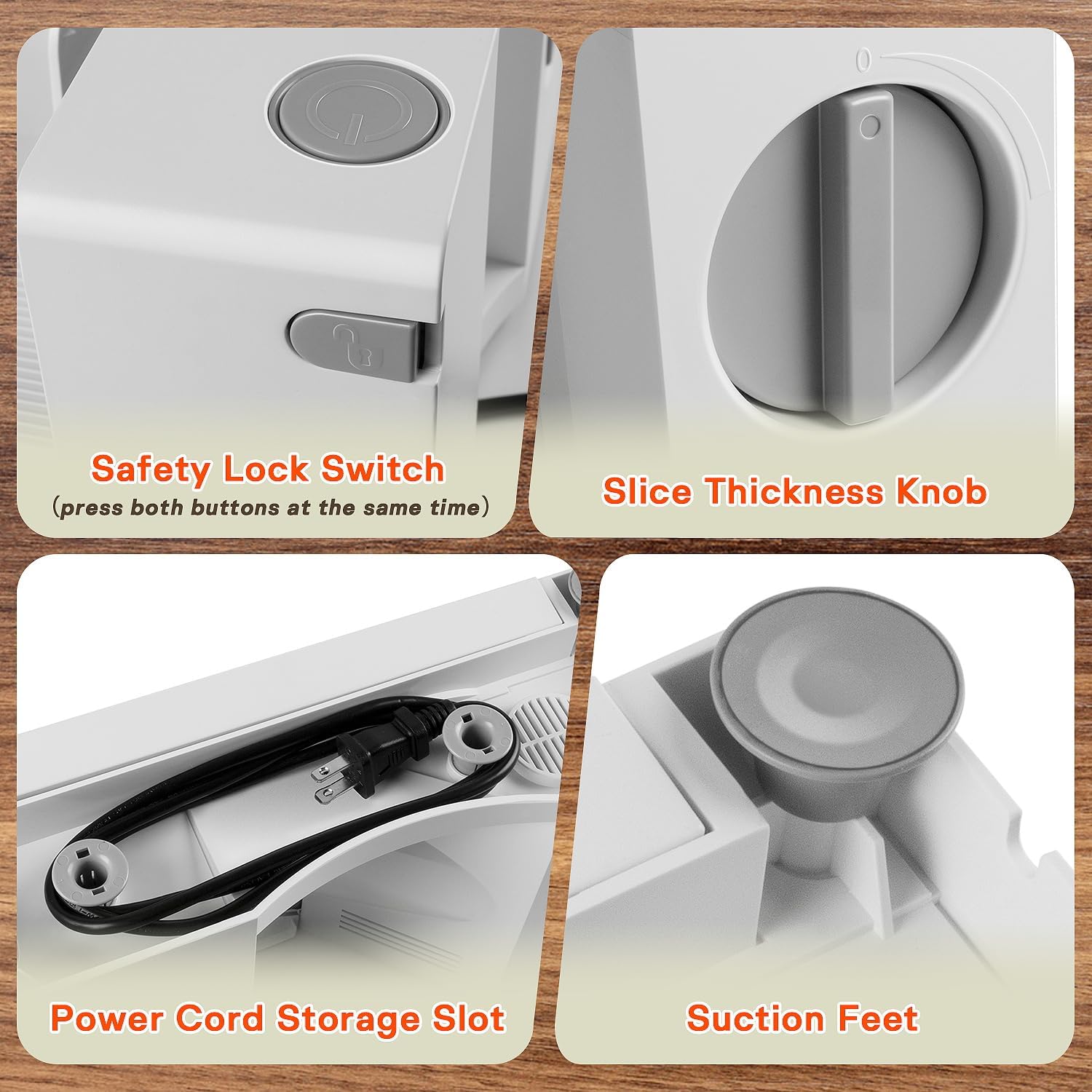 - UPGRADE: The meat slicer features a foldable design with a power cord storage compartment at the bottom for integrated storage. Additionally, this electric meat slicer is equipped with a child safety lock switch and seven powerful suction cup pads, significantly improving safety and stability during use