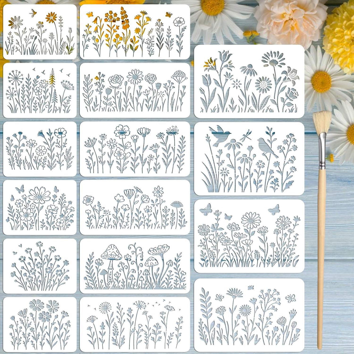 16PCS Large Flower Stencils for Painting Wildflower Stencils with Brushes Floral Spray Paint Stencil Reusable Drawing Template for Walls Garden Fence Furniture Card