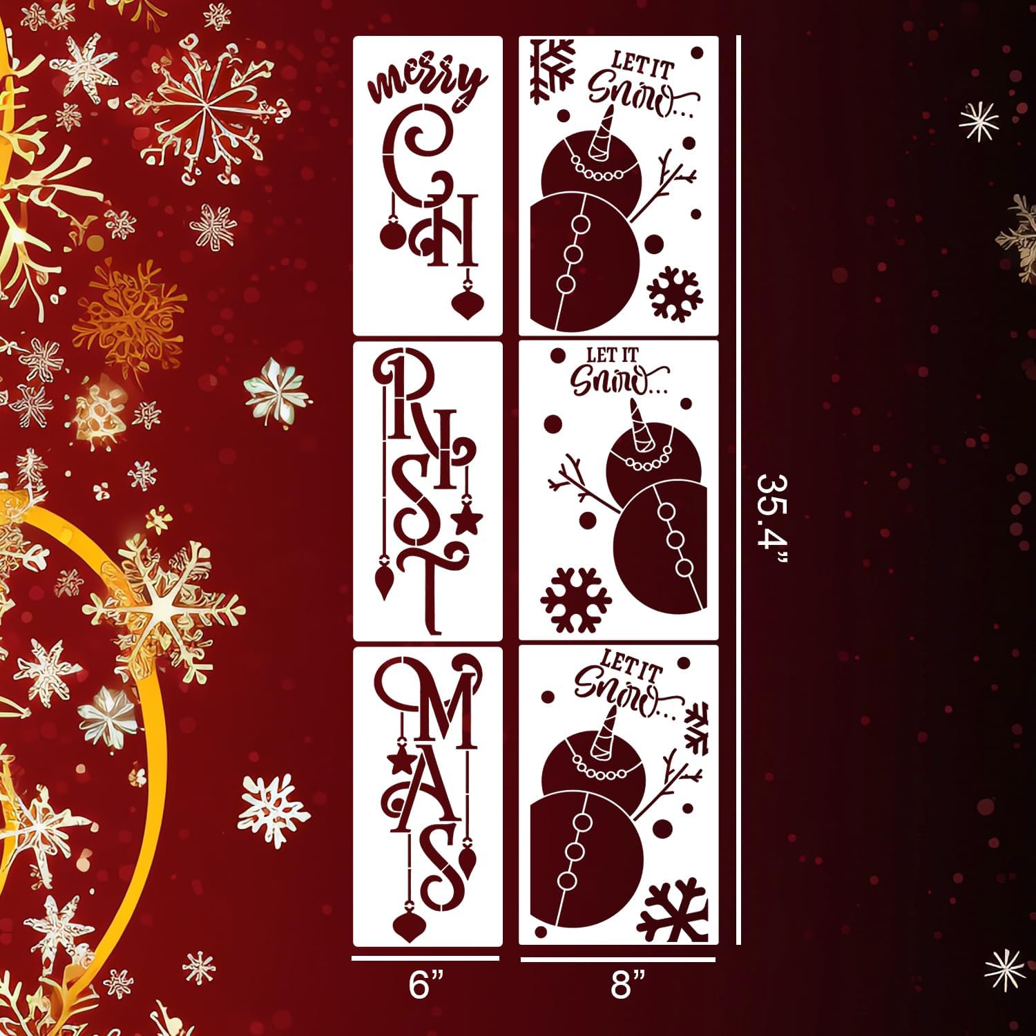 - Christmas Stencils:Exquisite patterns and quotes include let it snow,merry Christmas,believe,gnome welcome in 35.4x6inch and 35.4x8inch.The Christmas stencils for porch are the perfect addition to the porch decor.