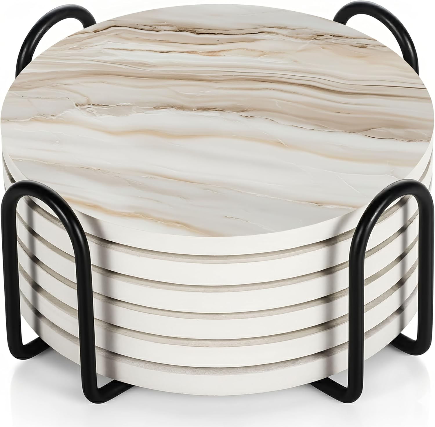 - INSIDE EVERY VEYRO SET: Each set includes 6 ceramic coasters (4" diameter, 0.28" thick) with a matte printed finish and soft cork backing that prevents slipping while creating a subtle floating effect, plus a sturdy black metal holder in smooth matte finish, all packed in a gift-ready box. The size was chosen with intention — wide enough for tumblers, mugs, wine glasses, or cocktails, yet balanced for smaller cups, candles, or planters. Each coaster carries a satisfying weight that feels premium in hand, combining elegance with everyday function to create a versatile piece that protects and decorates beautifully.