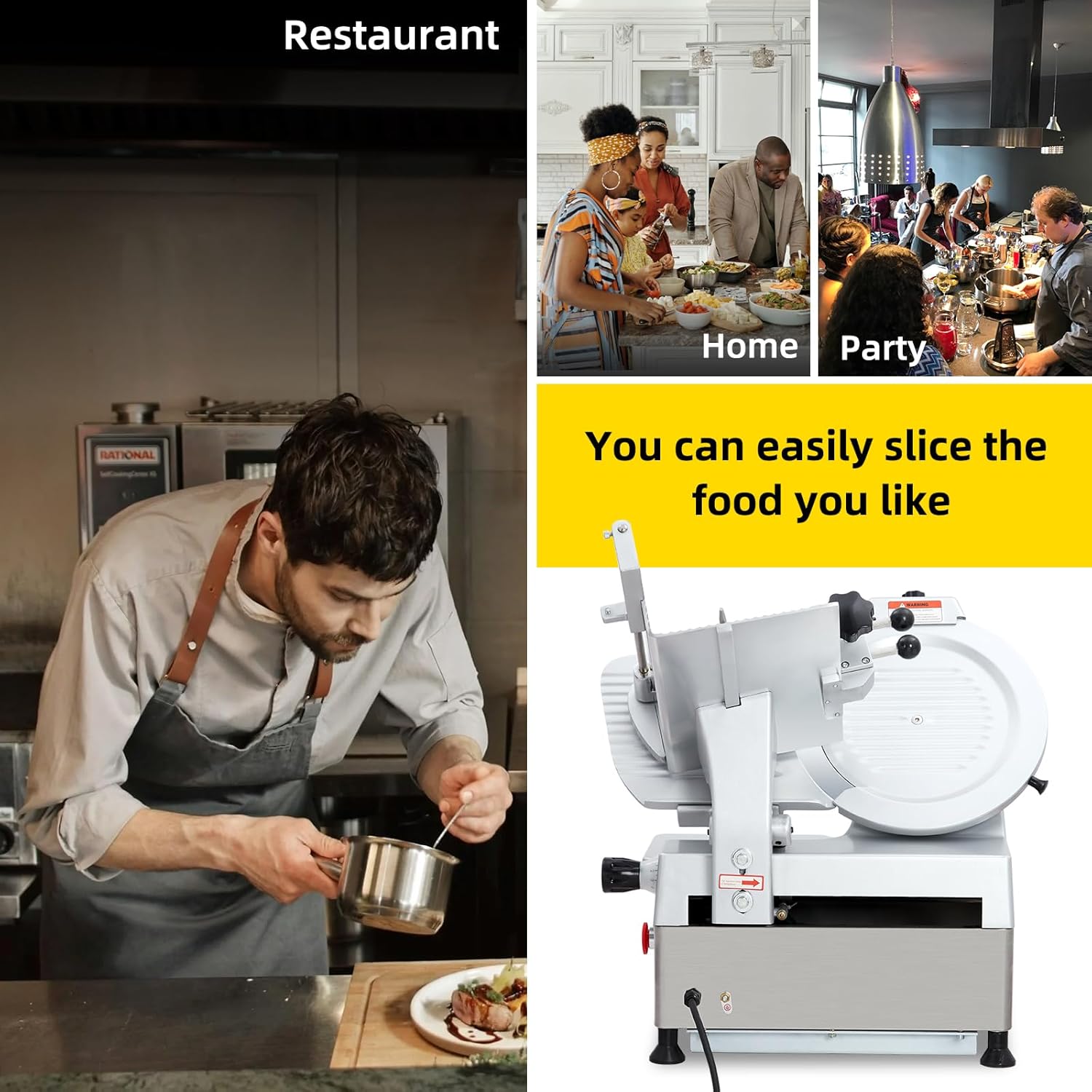 - 【Versatile for Home & Commercial Use】Multi-functional slicer cuts meat, cheese, roast beef, bread, and fresh veggies. (Note: Thaw frozen meat for 15 minutes first; slightly freeze fresh meat before slicing for more consistent cuts.) Suitable for home kitchens, restaurants, butcher shops, and canteens.